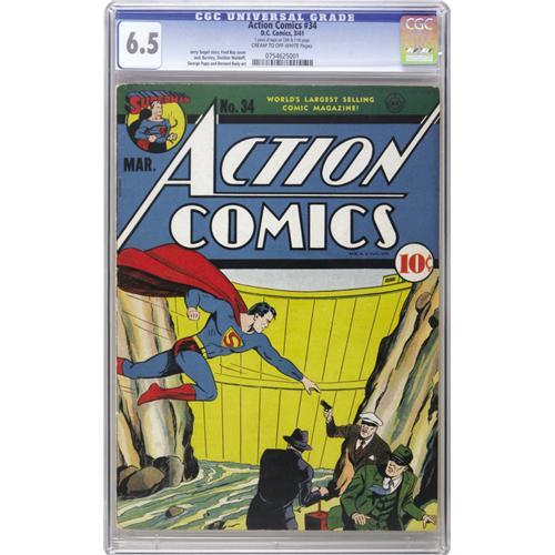 <B>Action Comics #34 (DC, 1941) CGC FN+ 6.5 Cream to off-white pages.</B></I> While technically a mid-grade book, the defects here are so minor in nature that you'll be getting a mighty attractive comic for your bidding dollar. Fred Ray is credited with the cover art for this early issue. CGC notes, "1 piece of tape on 10th and 11th page." Overstreet 2006 FN 6.0 value = $495; VF 8.0 value = $1,031. CGC census 9/06: 1 in 6.5, 8 higher.<BR><BR><b>Shipping:</b> Slabbed Comic (<a target="_blank" href="http://www.heritageauctions.com/common/shipping.php">view shipping information</a>)