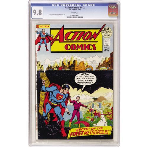 <B>Action Comics #412 (DC, 1972) CGC NM/MT 9.8 White pages.</B></I> Curt Swan and Murphy Anderson art. Overstreet 2006 NM- 9.2 value = $38. CGC census 3/07: 2 in 9.8, none higher.<BR><BR><b>Shipping:</b> Comics - Slabbed (certified) (<a target="_blank" href="http://www.heritageauctions.com/common/shipping.php">view shipping information</a>)