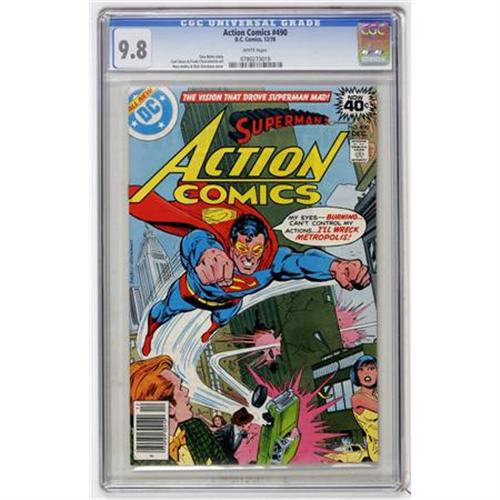 <B>Action Comics #490 (DC, 1978) CGC NM/MT 9.8 White pages.</B></I> Ross Andru and Dick Giordano cover. Curt Swan and Frank Chiraramonte art. Highest grade yet assigned by CGC for this issue. Overstreet 2007 NM- 9.2 value = $7. CGC census 10/07: 1 in 9.8, none higher. <I> From the Fantastic Frank Collection.</B></I><BR><BR><b>Shipping:</b> Comics - Slabbed (certified) (<a target="_blank" href="http://www.heritageauctions.com/common/shipping.php">view shipping information</a>)