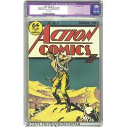 <B>Action Comics #5 (DC, 1938) CGC Apparent VF- 7.5 Moderate (P) Off-white pages.</B></I> Superman had not yet made his second cover appearance when this issue came out, but some of these early issues hold their own with great visual drama. This soldier of fortune cover by Leo O'Mealia is an excellent example. Gerber's <B>The Photo-Journal Guide to Comic Books</B></I> lists this book as "rare," and CGC's most recent census ranks this copy as the highest "Apparent" graded copy of issue #5 (the highest-graded unrestored copy earned a FN+ 6.5). CGC notes, "Restoration includes: color touch, pieces added, tear seals, reinforced." Overstreet 2004 GD 2.0 value = $1,346; VG 4.0 value = $2,692; FN 6.0 value = $4,038; VF 8.0 value = $9,422. <BR><BR><B>Important notice:</B> Heritage usually auctions material at the rate of 200-250 lots per hour. On some occasions eBay Live bid software or the Internet may not be able to keep up with the pace of the auction. We recommend placing a realistic absentee bid now as insurance to avoid disappointment. Occasionally the auctioneer may eliminate or reject an eBay Live bid, and the auctioneer may also reopen a lot after the close of the eBay live bidding (usually because we missed an audience bid), and may reject your bid even if it shows you as the winning bidder. By bidding via eBay Live, you agree that Heritage may award the lot to another bidder at its sole discretion under the circumstances described above or any other reasonable circumstances. Since eBay bids are not shown to us until we open the lot on the floor, we treat those bids just like floor bids. In most cases the floor responds before the eBay bid is presented to us, due to Internet lag time, so for consistency we have made it a policy that floor bids are always considered first over tie eBay live bids. Also please note that all Heritage lots purchased through eBay Live carry a 20% Buyer's Premium. Please make sure you read the Terms and Conditions before you bid. </span></font></tr></table></td></tr></table>