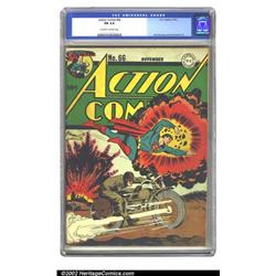Action Comics #66 (DC, 1943) CGC FN 6.0 Off-white to white pages. Superman once again lends a hand to the American military on this cover, as he protects a lone dispatcher who is caught under enemy fire. Jack Burnley and Joe Kubert illustrate this great early Action Comics issue which only has a small number of imperfections along the spine. Overstreet 2002 FN 6.0 value = $240. Important notice: We expect to be auctioning lots at the rate of 200-250 per hour. Sometimes eBay Premier live bid software cannot keep up with that pace, so we strongly recommend that you place a realistic proxy bid now as insurance to avoid disappointment. Also please note that all Heritage/CAA lots purchased through eBay Premier carry a 20% Buyer's Premium. Please make sure you read the Terms and Conditions.