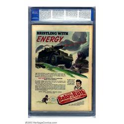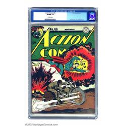 Action Comics #66 (DC, 1943) CGC VF/NM 9.0 Off-white pages. Only two other copies have graded out higher by CGC. Wanna bet they were pedigreed books? Start your own pedigree with this beauty, which features an explosive wartime Superman cover by Jack Burnley. The demand for all versions of Golden Age Superman books remains high, even more so for books of this quality. Overstreet 2002 VF 8.0 value = $500; NM 9.4 value = $875. Important notice: We expect to be auctioning lots at the rate of 200-250 per hour. Sometimes eBay Premier live bid software cannot keep up with that pace, so we strongly recommend that you place a realistic proxy bid now as insurance to avoid disappointment. Also please note that all Heritage/CAA lots purchased through eBay Premier carry a 20% Buyer's Premium. Please make sure you read the Terms and Conditions.