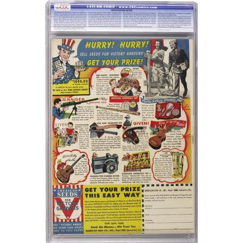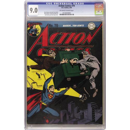 <B>Action Comics #70 (DC, 1944) CGC VF/NM 9.0 Off-white to white pages.</B></I> An unusual nighttime cover scene by Jack Burnley really makes this issue stand out. In the Superman story inside, mob figures go on a crime spree only to be thwarted by... Clark Kent? Other superhero stories in the issue include the Vigilante, Congo Bill, Zatara, and the Americommando (the latter with Bernard Baily art). To date, only the Mile High copy has been graded higher by CGC! Overstreet 2006 VF/NM 9.0 value = $1,007; NM- 9.2 value = $1,375. CGC census 10/06: 1 in 9.0, 1 higher.<BR><BR><b>Shipping:</b> Slabbed Comic (<a target="_blank" href="http://www.heritageauctions.com/common/shipping.php">view shipping information</a>)