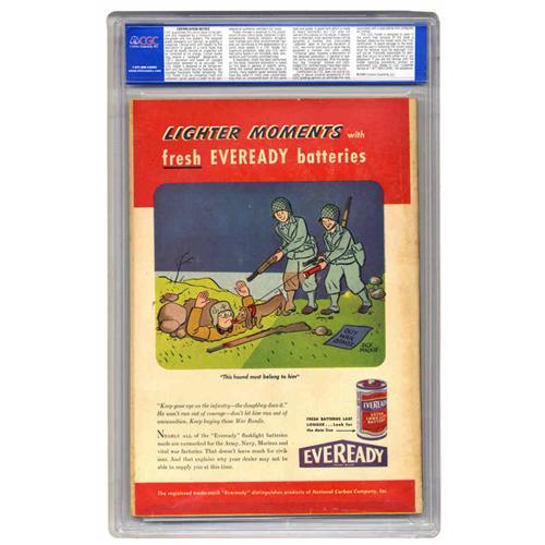 <B>Action Comics #79 "D" Copy pedigree (DC, 1944) CGC VF+ 8.5 Off-white pages.</B></I> Con man J. Wilbur Wolfingham was a recurring character in these 1940s Superman stories, and he even made it onto the cover this time. In this issue, he's not just counting sheep, he's conning sheep farmers, and it's up to Superman to put a stop to it. Zatara, Congo Bill, and the Vigilante appear in backup features. Overstreet 2005 VF 8.0 value = $506; VF/NM 9.0 value = $778. CGC census 11/05: 2 in 8.5, 3 higher.