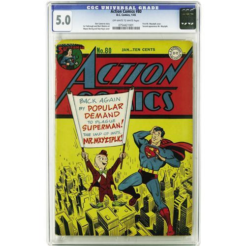 <B>Action Comics #80 (DC, 1945) CGC VG/FN 5.0 Off-white to white pages.</B></I> It's the second appearance of Mr. Mxyztplk, and the first time he appeared on a cover! Wayne Boring is credited with the cover art. Overstreet 2006 VG 4.0 value = $238; FN 6.0 value = $357. CGC census 3/06: 1 in 5.0, 10 higher.