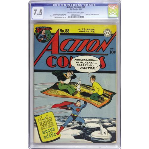 <B>Action Comics #88 (DC, 1945) CGC VF- 7.5 Cream to off-white pages.</B></I> John Sikela, probably better known for his work on Superboy, provided the cover art for this issue and also contributed story art along with Mort Meskin. Hocus and Pocus appear. Overstreet 2006 VF 8.0 value = $506. CGC census 9/06: 1 in 7.5, 3 higher.<BR><BR><b>Shipping:</b> Slabbed Comic (<a target="_blank" href="http://www.heritageauctions.com/common/shipping.php">view shipping information</a>)