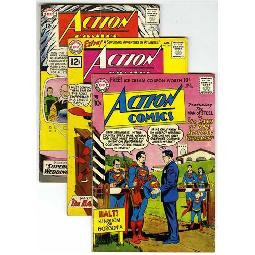 <B>Action Comics Group (DC, 1957-68) Condition: Average VG+.</B></I> Includes #233, 284 (Mon-El appearance), 307 (Saturn Girl appearance), 311, 314 (origin of Supergirl retold, JLA crossover), 315, 316, 317 (death of Nor-Kan of Kandor), 319 (Shrinking Violet appearance), 323, 324, 326, 327, and 362. Artists include Curt Swan, Wayne Boring, Jim Mooney, Neal Adams, and Kurt Schaffenberger. Approximate Overstreet value for group = $325.<BR><BR><b>Shipping:</b> Comics - Unslabbed (<a target="_blank" href="http://www.heritageauctions.com/common/shipping.php">view shipping information</a>)