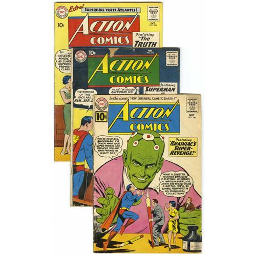 <B>Action Comics Group (DC, 1960-69) Condition: Average VG-.</B></I> Includes #269, 273, 280, 308, 317 (death of Nor-Kan of Kandor), 320, 323, 325, 326, 331, 355, 369, 374, and 377 (Legion of Super-Heroes feature stories begin). Artists include Curt Swan, Jim Mooney, Al Plastino, and Wayne Boring. Approximate Overstreet value for group = $225.<BR><BR><b>Shipping:</b> Comics - Unslabbed (<a target="_blank" href="http://www.heritageauctions.com/common/shipping.php">view shipping information</a>)
