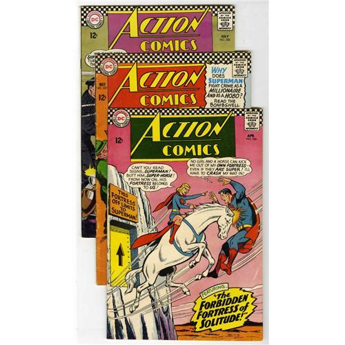 <B>Action Comics Group (DC, 1966-71) Condition: Average VG.</B></I> Includes #336 (origin of Flamebird), 337, 352, 354, 365 (JLA and Legion of Super-Heroes appearances), 367, 378, 381, 383, 385, 386, 387, 389, 392, 393, 396, 400, and 402 (Superman vs. Supergirl). Artists include Curt Swan, Jim Mooney, Al Plastino, Ross Andru, and Kurt Schaffenberger. Approximate Overstreet value for group = $150.<BR><BR><b>Shipping:</b> Comics - Unslabbed (<a target="_blank" href="http://www.heritageauctions.com/common/shipping.php">view shipping information</a>)