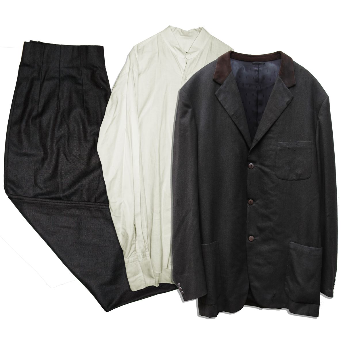 Carel Struycken limo driver costume from his memorable role as servant ''Lurch'' in ''Addams Family Values''. Struycken is incredibly tall, 7' and his suit measurements reflect his stature. Includes a dark grey suit jacket with a brown velvet collar, measuring 23'' x 36''; a cream-colored shirt measuring 23'' x 39'' and matching grey slacks measuring 48'' x 47''. Suit is presumably custom-made as there are no labels. Near fine. With provenance from Profiles in History's Hollywood Auction 11, lot 243.