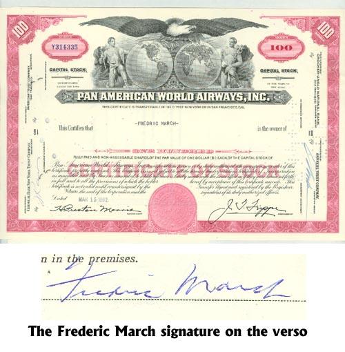 Frederic March. 1962, New York. Stock certficate for 100 shares issued to and signed by actor Frederic March on the verso. Facsimile signature of Juan Trippe. Lightly punch cancelled and in very fine condition overall.