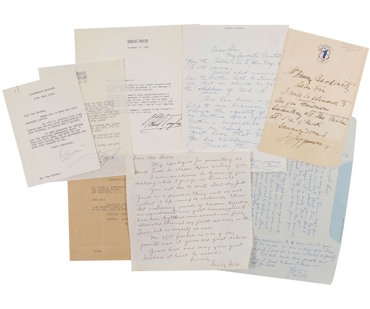 Collection of seven letters by various actors, including two TLSs and five ALSs. Signers are: Nils Asther, Jean Hersholt, Joseph Jefferson, Joel McCrea, Randolph Scott, and Robert Taylor (2). In overall fine condition.