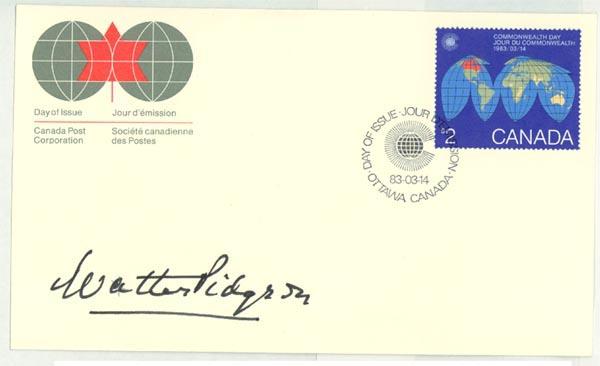 Walter Pidgeon. SFDC. 7 1/2" x 4 1/2". n.p. n.d. A Canadian first day cover signed by actor Walter Pidgeon. It is in choice condition.