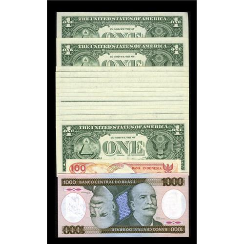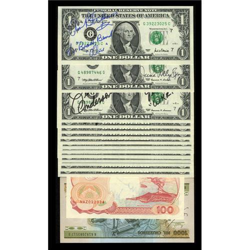 <B>Actors, Actresses, and Beauty Queens.</B></I><BR> The 1999 - 2003 $1 FRNs autographed in this lot are by Don Adams, Maud Adams, Jerry Adler, June Allyson, Loni Anderson, Anne Archer, John Ashton, Ed Asner, Angela Perez Baraquio (personalized), Joanna Barnes, Douglas Barr (on a Brazil note), Ann B. Davis, Lee Grant, Julie Harris, Markie Post, anf Liz Sheridan. <B>Gem Crisp Uncirculated.</B></I><BR><BR><b>Shipping:</b> Coins & Currency (<a target="_blank" href="http://www.heritageauctions.com/common/shipping.php">view shipping information</a>)