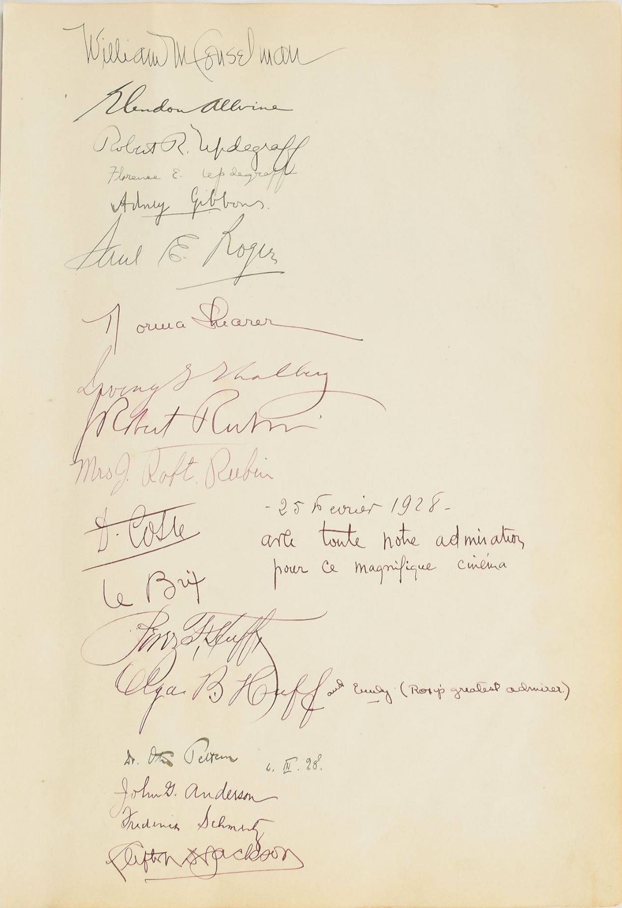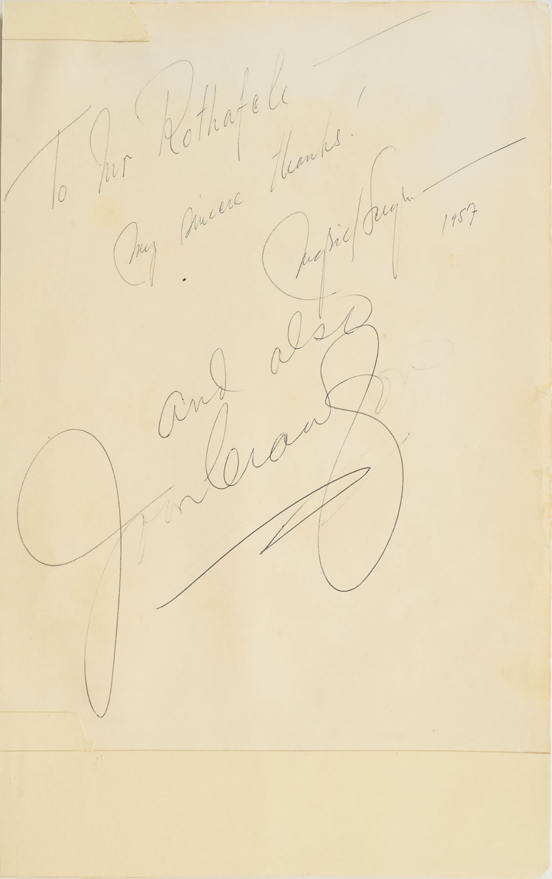 Three vintage autograph album pages, 10.25 x 14 and 9 x 14, dated between 1928 and 1957, signed on the front and back of each in ink or fountain pen by a variety of celebrities, with some inscribed, including: Ingrid Bergman, Joan Crawford, Douglas Fairbanks, Richard E. Byrd, Jack Dempsey and wife Estelle Taylor, Norma Shearer, Irving Thalberg, Grantland Rice, Bill Veeck, Barney Dreyfuss, Sam Breadon, Jack Hendricks, Frank Dole, Dieudonné Costes and Joseph-Marie Le Brix, Prince Joachim Albert of Prussia, Anne Roselle, Anolyn Arden, and others. In fine condition.
