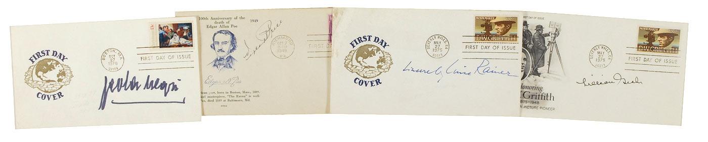 Four different FDCs, each signed on the front in ink or felt tip by a different actor or actress. Signers are: Lillian Gish, Pola Negri, Luise Rainer, and Vincent Price. In very good condition, with pencil remnants to two covers, uniform toning to Price’s cover, and creases to Gish’s cover.