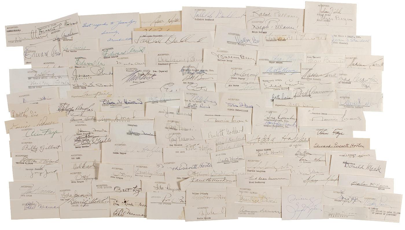 Signers are: Franklin Adams, Brian Aherne, Frankie Albert, Don Ameche (2), Eddie Arnold (3), Mischa Auer, Gene Autry, Lew Ayres, Phil Baker, Tallulah Bankhead (2), Ralph Bellamy (2), Constance Bennett (2), Joan Bennett, Edgar Bergan (2), Milton Berle, Wallace Berry (2), Joan Blondell (2), Beulah Bondi, Fanny Brice, Frank Buck, Bob Burns (2), James Cagney, Cab Calloway, Eddie Cantor (2), Madeline Carroll, Claudette Colbert, Joan Crawford, Bing Crosby, Robert Cummings, Bette Davis (4), Olivia deHavilland (2), Marlene Dietrich, Dorothy Dix, Melvin Douglas, Louise Dresser, Jimmy Durante, Deanna Durbin, Ann Dvorak, Maurice Evans (2), Douglas Fairbanks, Jr., Alice Faye (2), Henry Fonda (2), Kay Francis (2), Billy Gilbert, Paulette Goddard, Betty Grable, William S. Hart, Bob Hawk, Hugh Herbert, Bob Hope, Miriam Hopkins, Hedda Hopper (2), Edward Everett Horton, Esward Everett Horton, Walter Huston (2), George Jessel, Chick Johnson, Otto Kruger (3), OttoMacMurrayOtto Kruger, Dorothy Lamour (5), Charles Laughton (2), Beatrice Lillie, Paul Lukas, Ida Lupino (2), Betty Lytell, Jeanette MacDonald, Fred MAcMurray (2), Fredric March, MAry Martin, Graham McNamee (2), Donald Meek, Lauritz Melchoir, Ethel Merman (2), Erin O’Brien Moore, Chester Morris, Pat O’Brien (2), Walter O’Keefe, Merle Oberon (2), Olsen and Johnson, Jean Parker, Gail Patrick (2), Zasu Pitts, George Raft (2), Claude Rains, Eddie Rickenbacker, Tommy Riggs, Edward G. Robinson, Ginger Rogers (3), Mickey Rooney (2), Charlie Ruggles, Rosalind Russell (3), Sabu, Red Skelton, Cornelia Otis Skinner, C. Aubrey Smith (3), Ann Sothern (2), Barbara Stanwyck (2), Dorothy Thompson, Gene Tierney, Lana Turner, Rudy Vallee (3), Johnny Weismuller, Roland Young, and Victor Young.