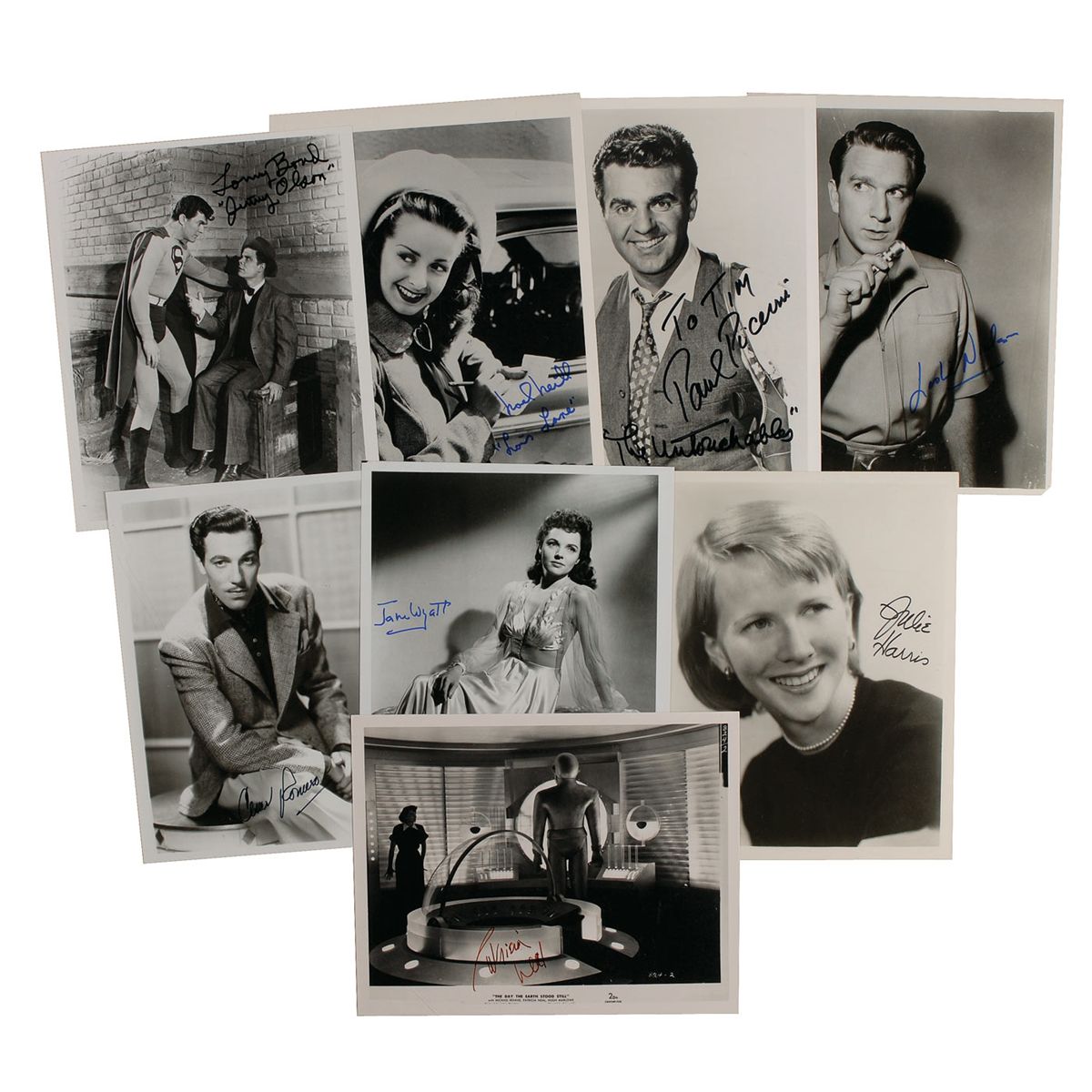 Eight glossy photos, 8 x 10 and 10 x 8, featuring classic actors and actresses, each signed in felt tip by the respective performer pictured. Signers are: Noel Neill, Tommy Bonds, Julie Harris, Patricia Neal, Leslie Nielsen, Jane Wyatt, Cesar Romero, and Paul Picerni (ins). In fine condition, with a chip to the bottom right corner of Nielsen’s image.