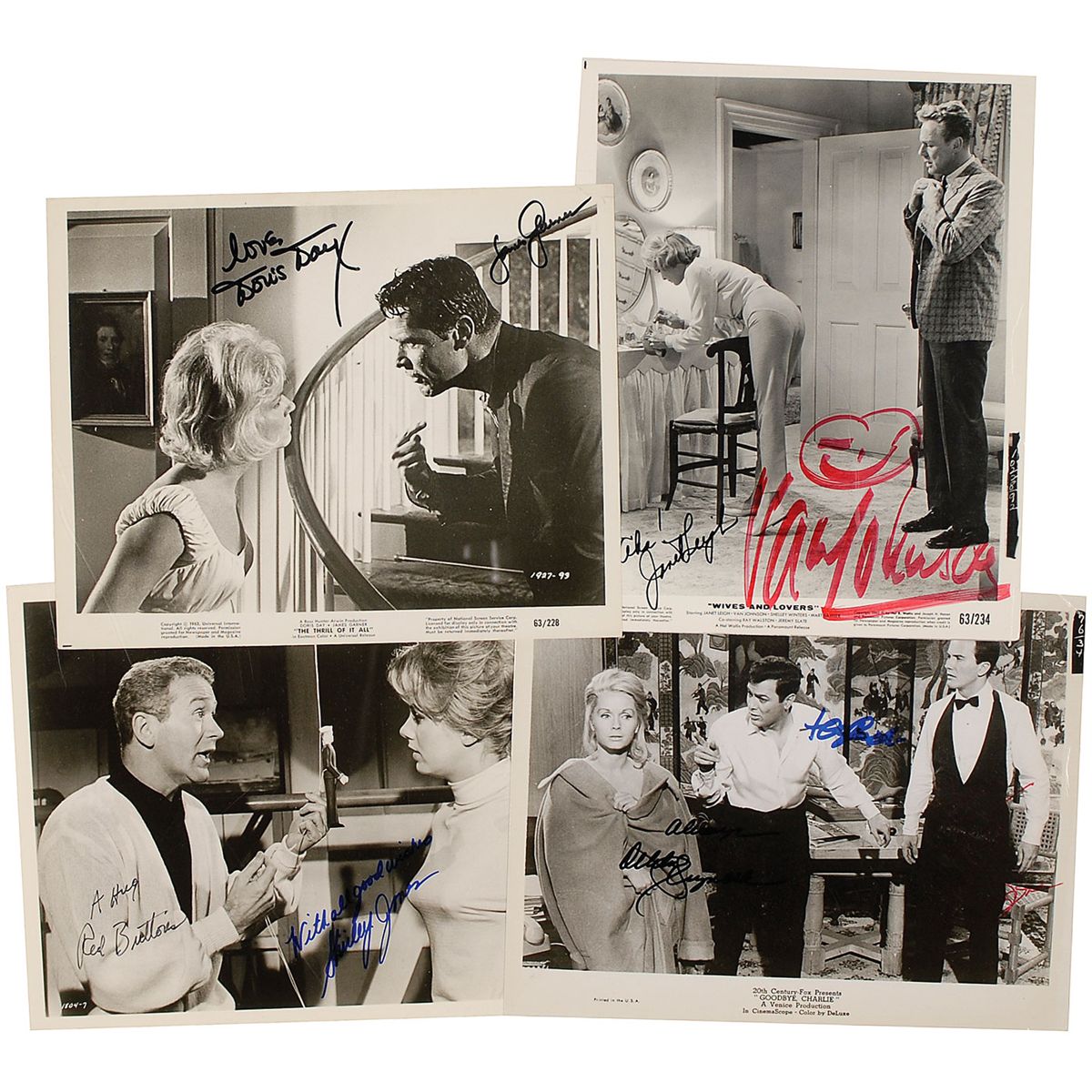 Four glossy movie promotional photos, one 8 x 10 and three 10 x 8, each signed in felt tip by the respective actors and actresses pictured. Signers are: Van Johnson and Janet Leigh; Red Buttons and Shirley Jones; Doris Day and James Garner; and Debbie Reynolds, Tony Curtis, and Pat Boone. In very good overall condition, with heavy contrast to Boone’s signature.