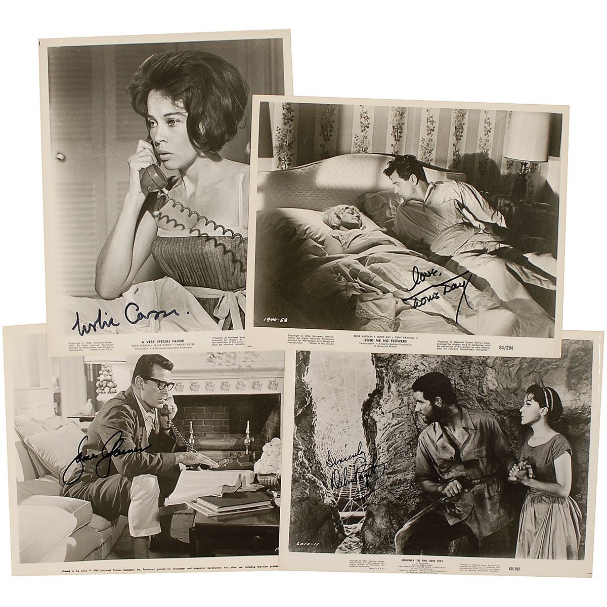 Four glossy photos, three 10 x 8 and one 8 x 10, each signed in felt tip by the respective actor or actress pictured. Signers are: Leslie Caron, James Garner, Debra Paget, and Doris Day. In very good overall condition.