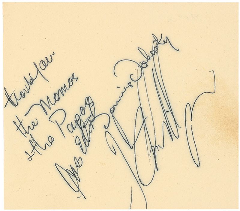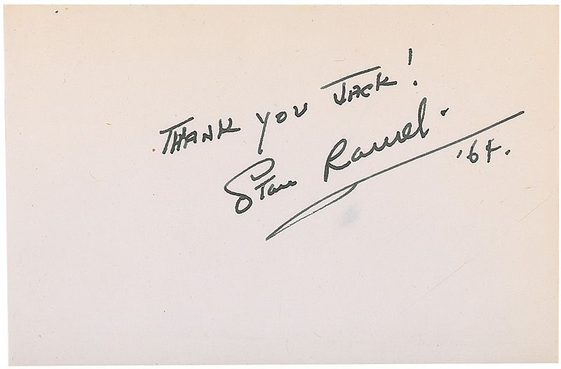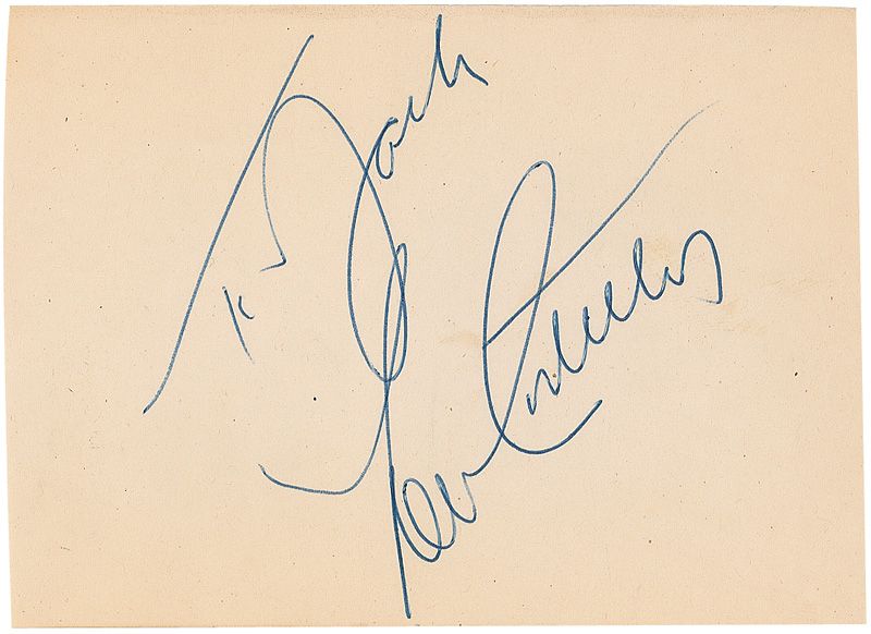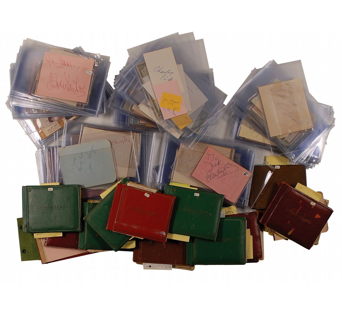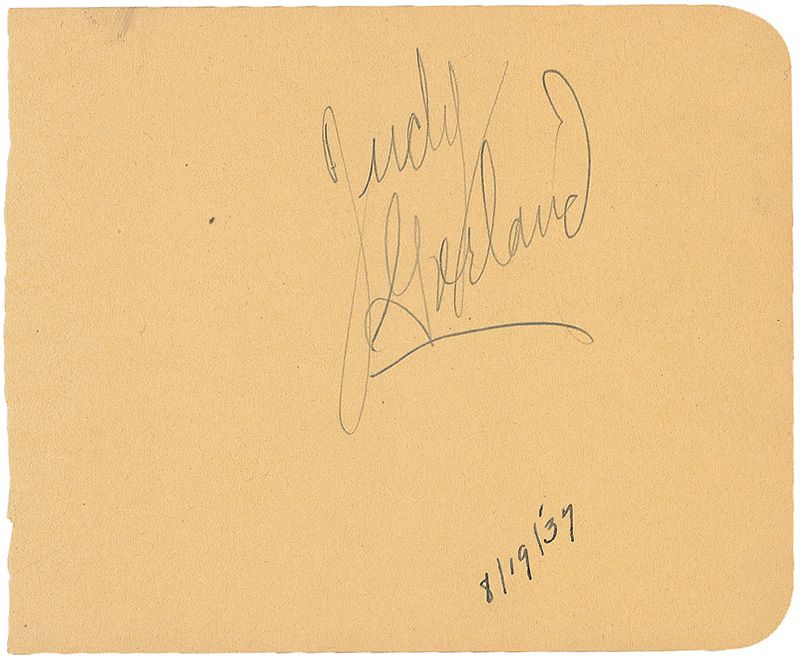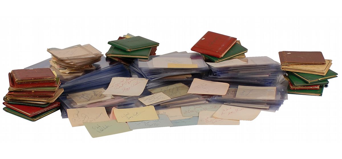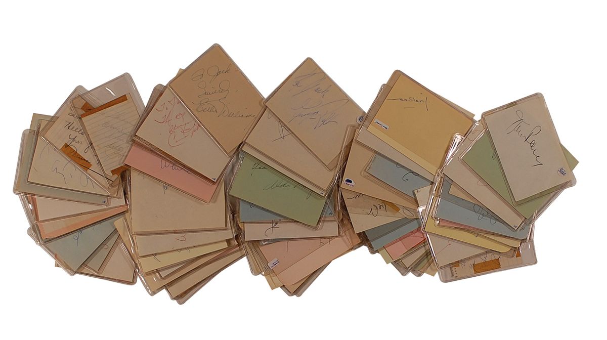 Sizable vintage autograph collection consisting of 25 autograph albums containing a little over 1000 autographs and approximately 300 loose album pages. Almost all of the pages contained within the albums are single-signed and single-page, with almost all signatures being in ink, with most signers having inscribed to Jack as well. Signers include: Judy Garland (2, including one from 1937), Audrey Hepburn, Marlon Brando, Gary Cooper, John Wayne, Peter Lorre, Lou Costello, Jane Darwell, Cary Grant, Edith Piaf, Darla Hood, Bobby Jordan, Gail Russell, Thomas Mitchell, Glenn Strange, Ingrid Bergman, Peter Lawford, Ernie Kovacs, Errol Flynn, Hugh Griffith, Ernest Thesiger, Vivien Leigh, Laurence Olivier, Charles Laughton, Chico Marx, William Frawley, Primo Carnera, Jack Haley, Anna Magnani, Dorothy Dandridge, Nick Adams, Claude Rains, Stan Laurel, Jayne Mansfield, Johnny Weismuller, Orson Welles, Spencer Tracy, Irene Ryan, Donald Crisp, Victor McLaglen, Susan Hayward, George Stevens, Richard Burton, Katina Paxinou, Marjorie Main, and Percy Kilbride. A pencil signature of Elvis Presley is included, which rates in fair condition. In very good overall condition. A wonderful collection from the ‘golden age’ of Hollywood, totaling over 1300 meticulously acquired signatures. A more comprehensive list is available for download at rrauction.com.