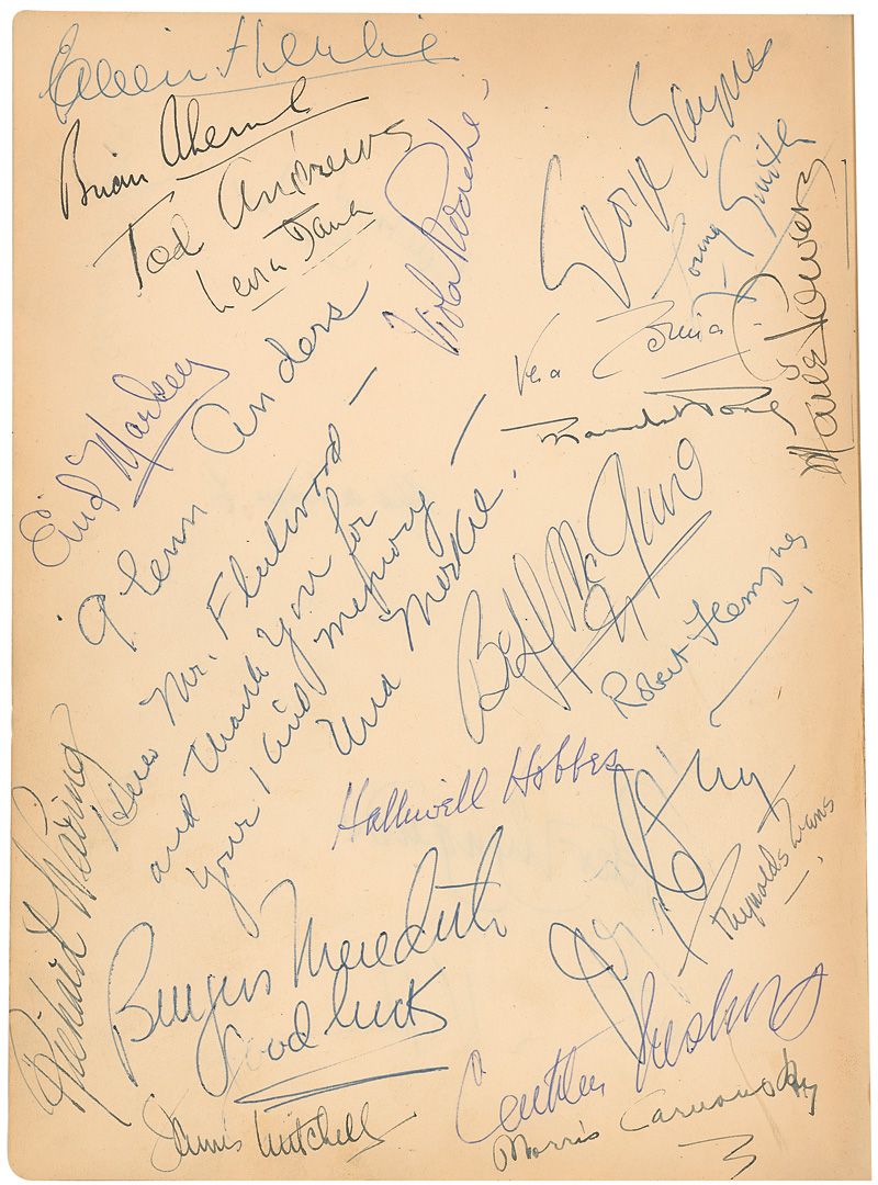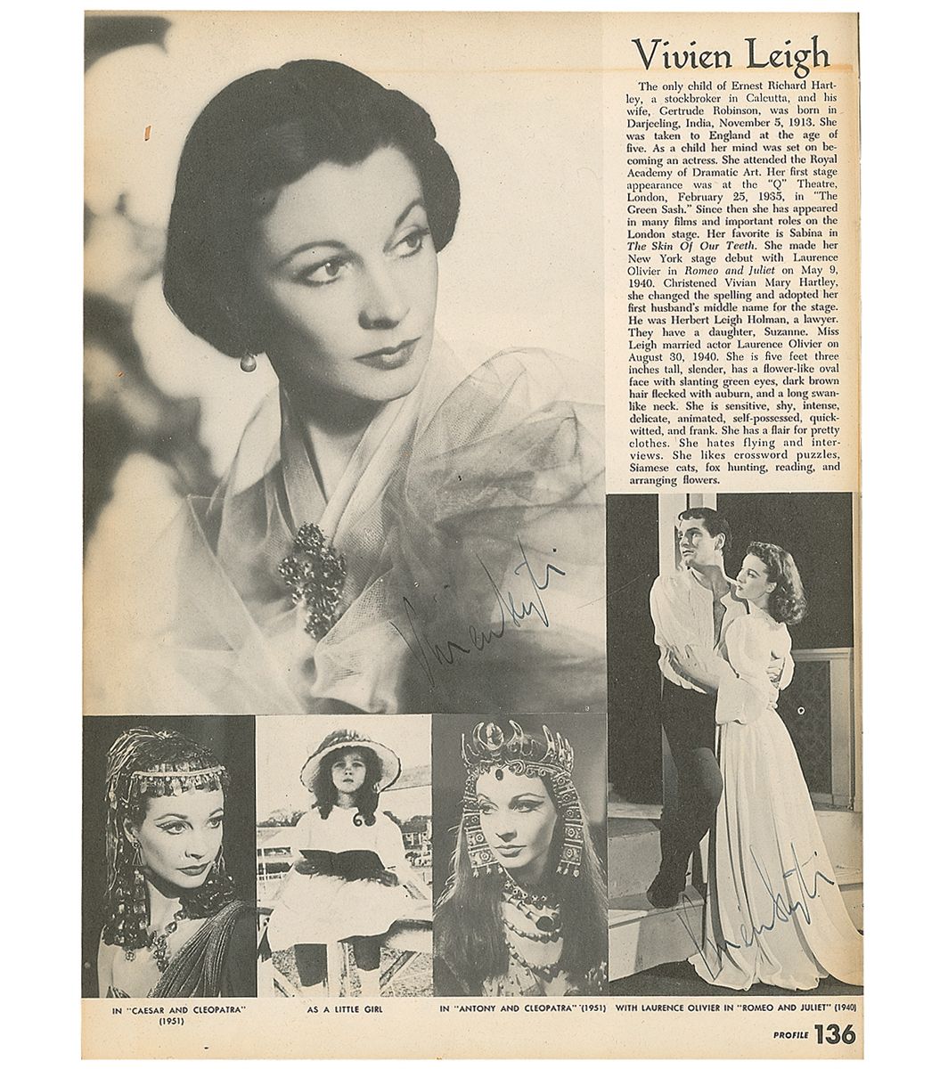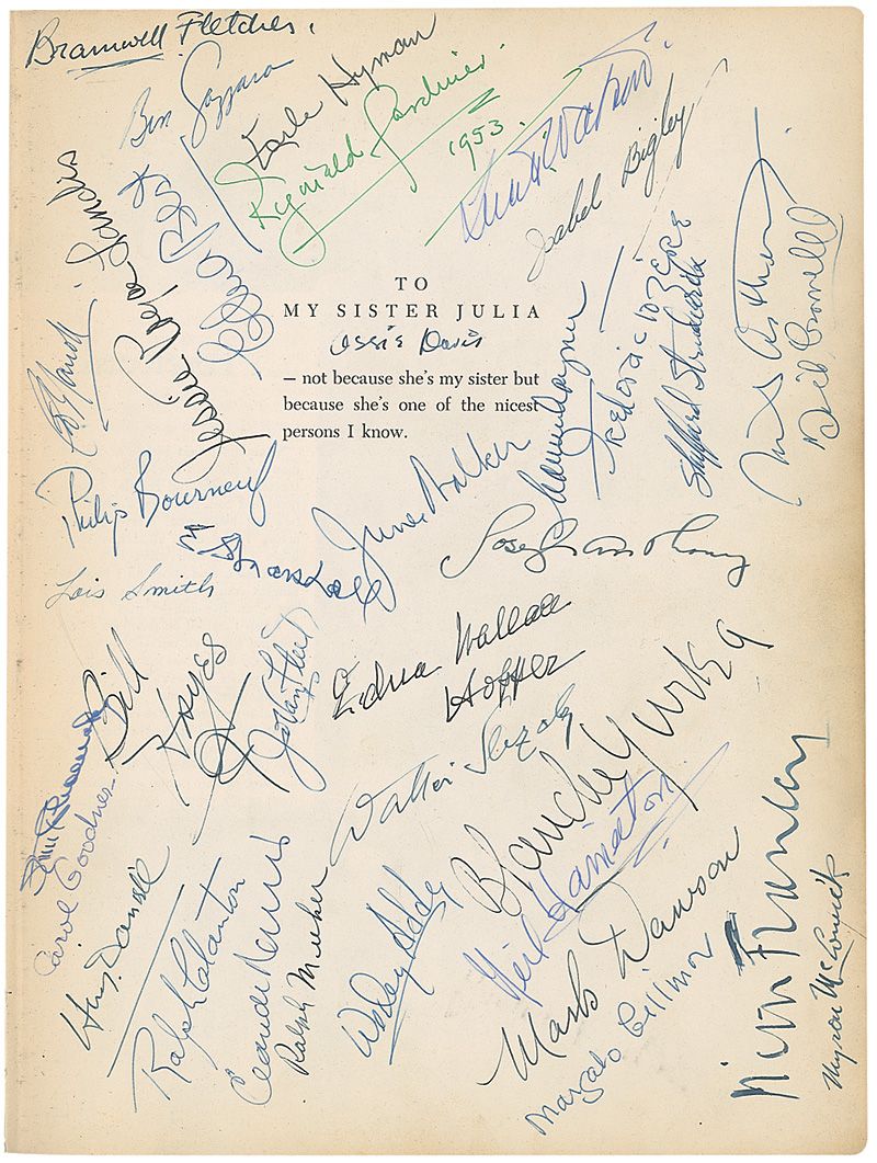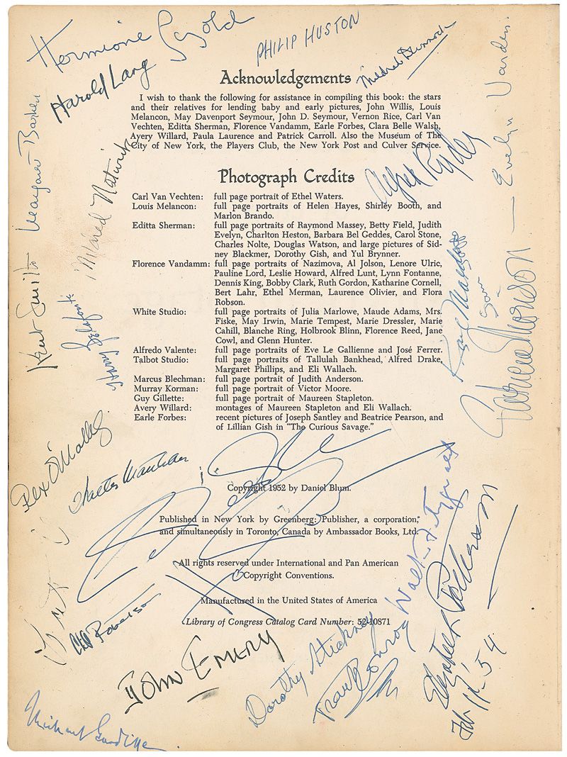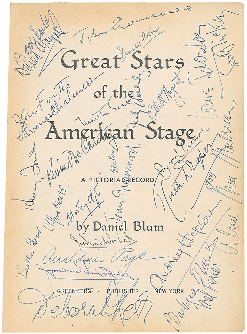 Signed book: Great Stars of the American Stage. First edition. NY: Greenberg, 1952. Hardcover, 9.25 x 12.25. Signed on the opening and closing end pages by Katherine Hepburn, Boris Karloff, Henry Fonda, Monty Clift, Deborah Kerr, Audrey Hepburn, Burgess Meredith, Una Merkel, Vera Zorina, Brian Aherne, James Mitchell, Clifford Odets, Judy Holliday, Martha Scott, Ruth Draper, Mel Ferrer, Geraldine Page, Howard Lindsay, Harry Belafonte, Frank Conroy, Edna Hopper, Bill Hayes, Myron McCormick, and many others. Also signed inside by their respective photographs by Frances Starr, Walter Hampden, Billie Burke, Victor Moore, Virginia Brian, Florence Reed, Mary Boland, Eva Le Galliene, Ina Claire, Alfred Lunt, Lynn Fontanne, Dennis King, Judith Anderson, Hazel Dawn, Peggy Wood, Helen Hayes, Ruth Gordon, Katharine Cornell, Josephine Hull, Fredric March, Lillian Gish, Beatrice Lillie, Bert Lahr, Tallulah Bankhead, Ethel Merman, Maurice Evans, Mary Martin, John Gielgud, Shirley Booth, Ethel Waters, Laurence Olivier, Betty Field, Alfred Drake, Uta Hagen, Sidney Blackmer, Jose Ferrer, Judith Evelyn, Vivien Leigh (2x), Yul Brunner, Julie Harris, Barbara Bel Geddes, Charlton Heston, Charles Nolte, Carol Channing, Margaret Phillips, Eli Wallach, Maureen Stapleton, Douglas Watson, and Joan McCracken. Front cover almost completely separated, spine partially detached, mild to moderate toning to opening and closing pages, and scattered wear to covers, otherwise very good condition. An impressive assemblage of a who’s who of 1950s Hollywood.