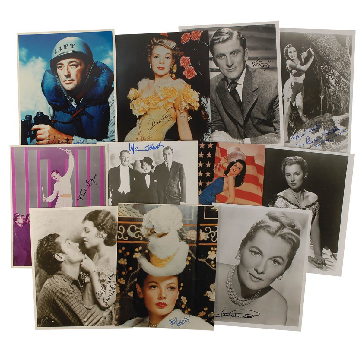 Eleven photos of various finishes, each approximately 8 x 10, five color, each signed by the actor or actress pictured. Signers are: Fred Astaire, Robert Mitchum, Marlene Dietrich, Kirk Douglas, Joan Fontaine, Gene Tierney, Janet Gaynor, Ann Miller, Olivia de Havilland, Alice Faye, and Maureen O'Sullivan. In overall fine condition.