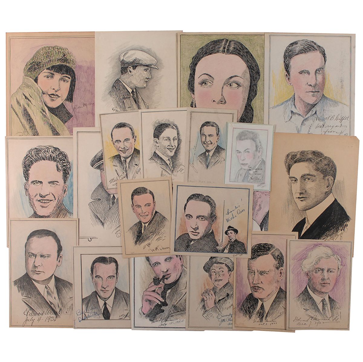 Twenty original vintage ink and colored pencil sketches of actors and actresses on sheets ranging in size from 4 x 5.5 to 8 x 11.5, each signed by the subject. Signers are: Walter Huston, Francis X. Bushman, Ronald Colman, Ben Lyon, Joe Penner, Georgie Price, Herbert Rawlinson, Fred Allen, Bob Burns, Jim Londos, Ricardo Cortez, Edward Arnold, Morton Downey, Mischa Auer, James Dunn, Hobart Bosworth, John Boles, Patricia Morison, Colleen Moore, and Wesley Eddy. Each sketch is also signed and dated by the artist, “Griffith,” with dates ranging from 1914 to 1940. In overall fine condition.