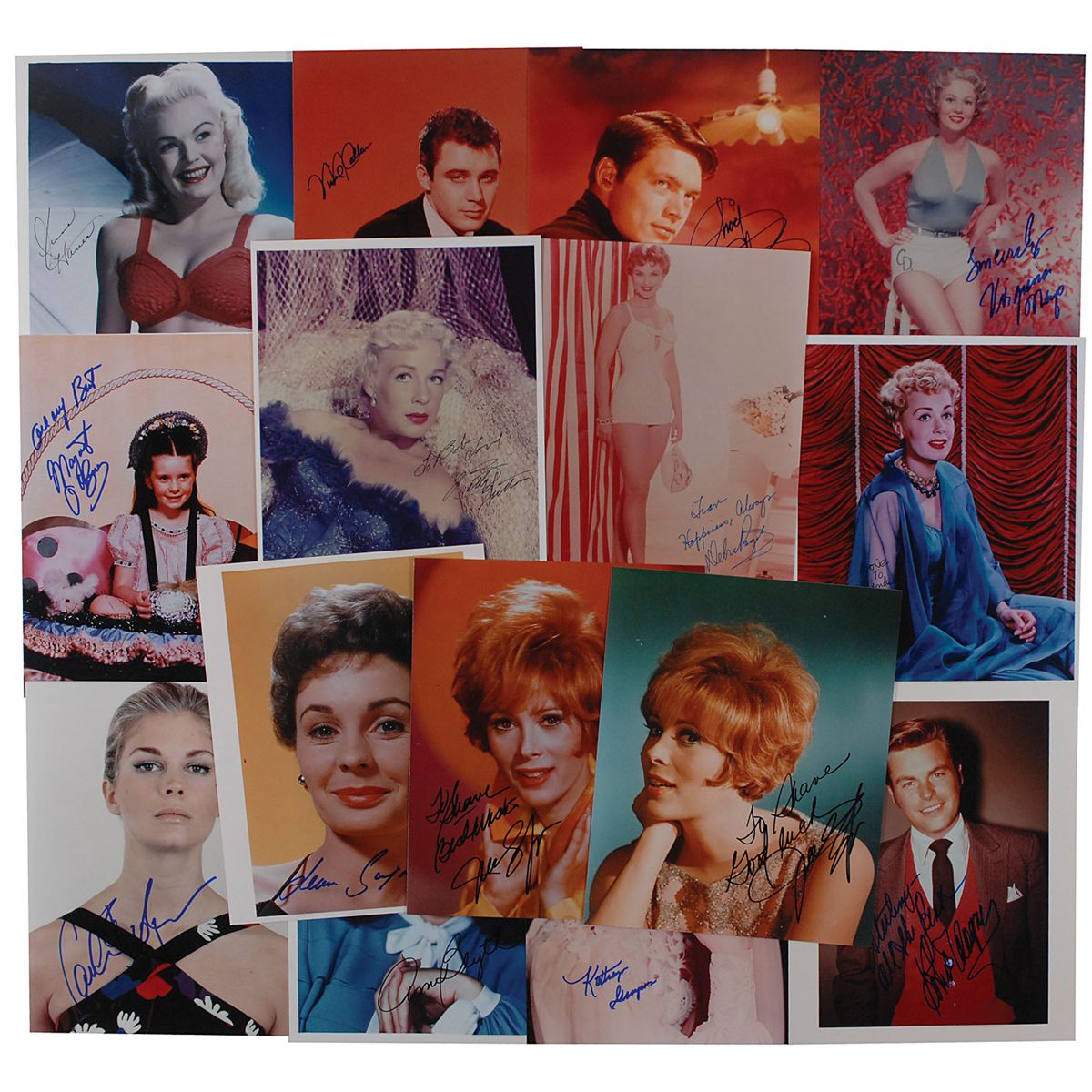 Seventeen color glossy photos, sixteen 8 x 10 and one 10 x 8, each signed in felt tip or ink by the actor or actress pictured. Signers are: June Haver, Jill St. John (2 ins), Debra Paget (ins), June Havoc (ins), Robert Wagner (2 ins), Betty Hutton (ins), Jean Simmons, Terry Moore, Margaret O’Brien, Virginia Mayo, Kathryn Grayson, Anne Blyth, Chad Everett, Candice Bergen, and one other. In overall fine condition.