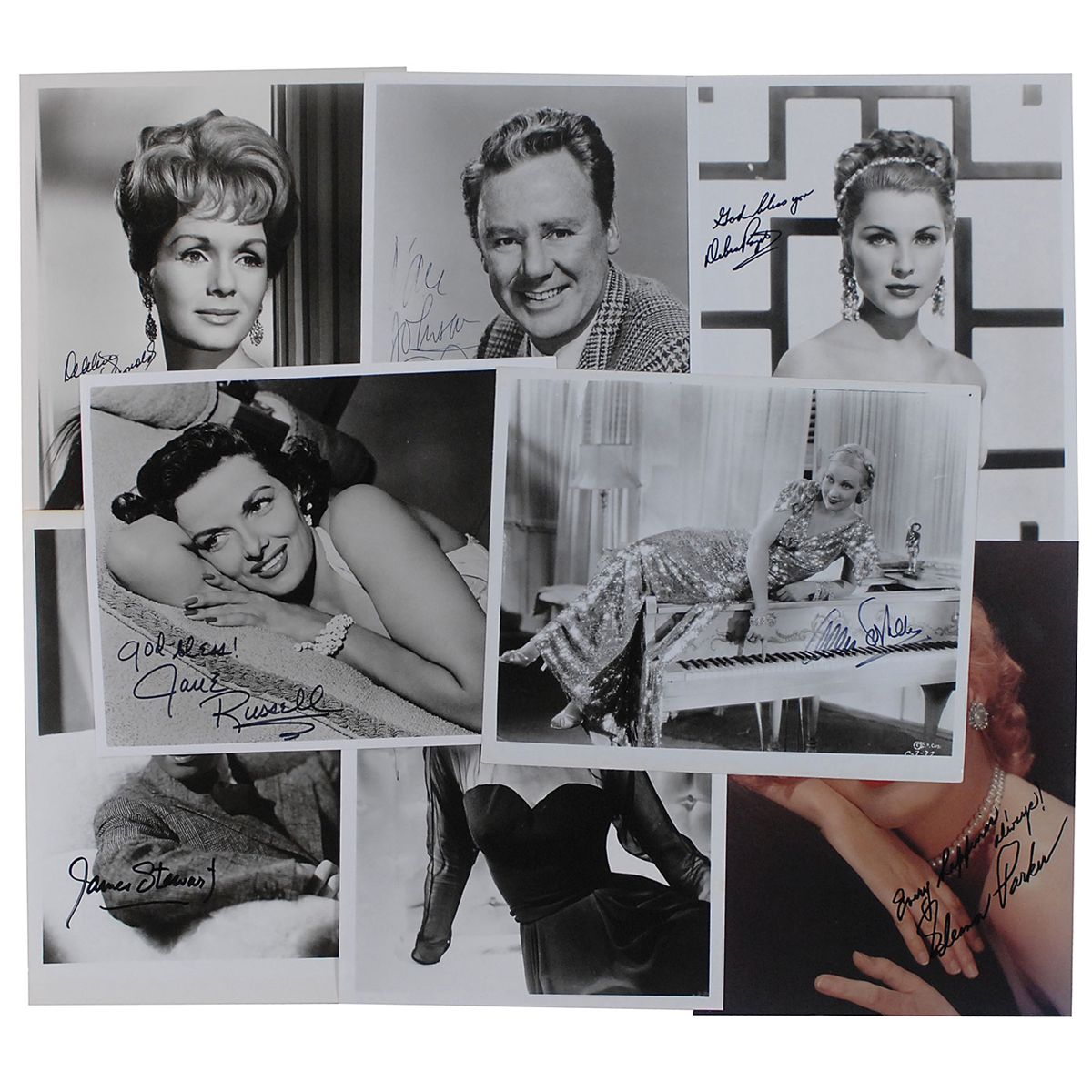 Collection of eight glossy and satin-finish photos, six 8 x 10 and two 10 x 8, including one color, each signed in felt tip or ballpoint by the actor or actress pictured. Signers are: James Stewart, Van Johnson, Debbie Reynolds, Debra Paget, Gloria DeHaven, Ann Sothern, Jane Russell, and Eleanor Parker. In fine condition, with some light toning along top edge of Stewart’s photo.