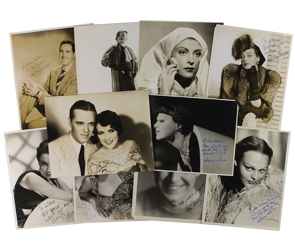 Ten original circa 1930s–40s photos of various finishes, most approximately 10 x 13 or 13 x 10, each signed and inscribed later in ink by the actor or actress pictured. Signers are: Hazel Brooks, Mary Carlisle, Patricia Morison (2), Bernice Claire, Ann Doran, Katherine DeMille (2), Regis Toomey, and Patric Knowles. In overall very good to fine condition. All photos are vintage studio portraits, including photographers: Fryer, Richee, Bull, Schafer, and Welbourne.