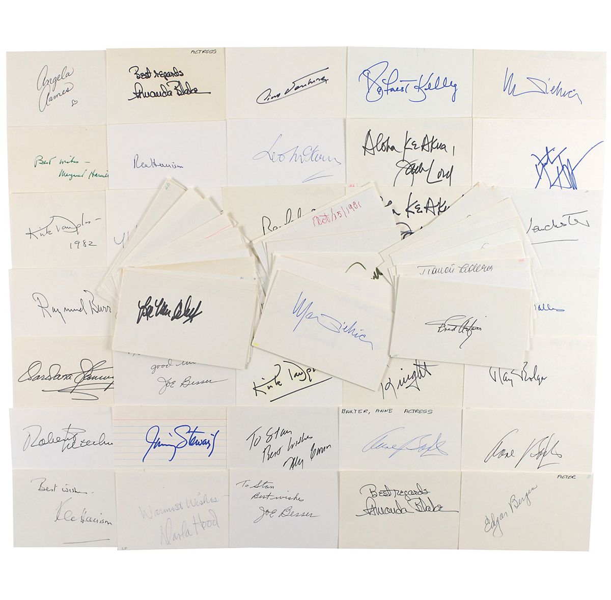 Nice collection of 89 signatures of various actors and actresses on individual off-white 5 x 3 cards. Signers are: Angela Aames, Fred Astaire (3), Wesley Barry (2), Anne Baxter (4), Edgar Bergen, Joe Besser (2), Amanda Blake (3), Ray Bolger, Raymond Burr (2), John Candy, Johnny Carson (2), Dick Clark, Scatman Crothers (2), Peter Cushing, Patti D'Arbanville, John Dehner (2), Marlene Dietrich (4), Kirk Douglas (2), Jimmy Durante, Stepin Fetchit, Ava Gardner (2), Alec Guinness (2), Margaret Hamilton (2), Rex Harrison (2), Dana Hill, Terence Hill, Dustin Hoffman, Darla Hood, Ron Howard, Jim Jordan, DeForest Kelley, Werner Klemperer, Ted Knight (4), Elsa Lanchester (2), Francis Lederer, Jack Lord (2), Leo McKern, Robert Mitchum, Elizabeth Montgomery, Dudley Moore, David Niven, Gregory Peck, Michelle Pfeiffer, Vincent Price, Denver Pyle (3), Christopher Reeve, Lee Remick (2), Hal Roach (2), John Russell, Randolph Scott, Barbara Stanwyck (2), James Stewart, Lee Van Cleef (3), Lino Ventura, Max von Sydow, and Hal Wallis. In overall fine condition.