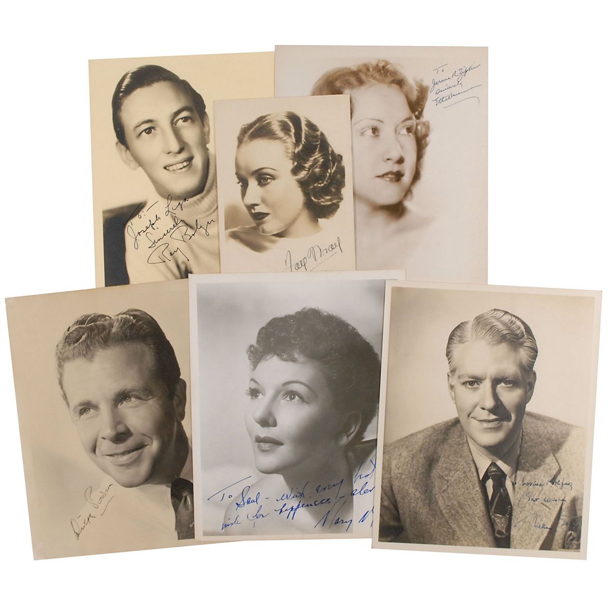 Collection of six vintage photos, one 5 x 7 and five 8 x 10, each signed by the actor or actress pictured. Signers are: Fay Wray, Ray Bolger (ins), Mary Martin (ins), Ethel Merman, Dick Powell, and Nelson Eddy (ins). In overall fine condition.