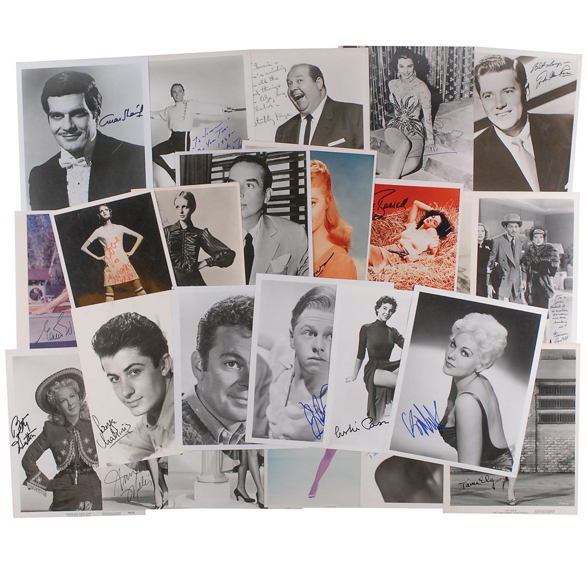 Collection of 24 photos of various sizes, most being 8 x 10, each signed by the actor or actress pictured. Signers are: Leslie Caron, George Chakiris, Cyd Charisse (2), Taina Elg (2), Shirley Jones, Stubby Kaye, Gordon MacRae, Ann Miller (2), Vicente Minnelli, Kim Novak, Eleanor Powell, Erik Rhodes, Mickey Rooney, Jane Russell, Vivienne Segal, Omar Sharif, Jean Simmons, Betty Sutton, Russ Tamblyn, Gwen Verdon, and Esther Williams. In overall fine condition.