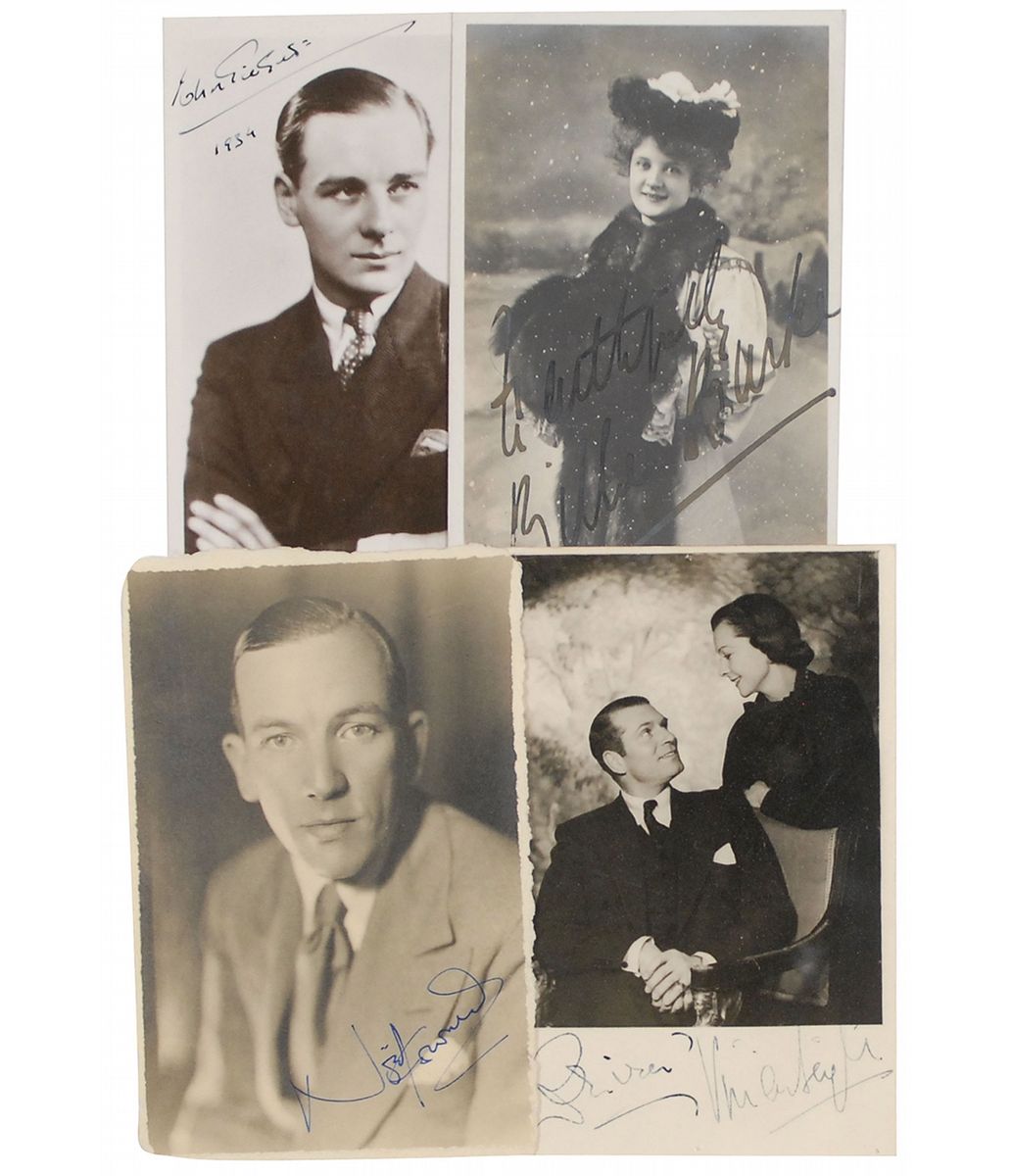 Excellent collection of four photos, all roughly 3.5 x 5.5, each signed by a notable actor or actress, including: Vivien Leigh and Laurence Olivier, Noel Coward, Billie Burke, and John Gielgud. In overall fine condition. Individual descriptions are as follows: