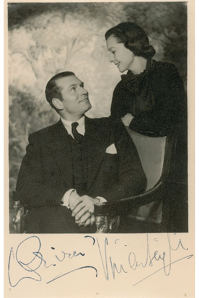 Leigh and Olivier: Vintage matte-finish 3.5 x 5.5 photo of the Hollywood couple together, signed in the lower border in fountain pen, “Vivien Leigh” and “L. Olivier.” In fine condition, with unobtrusive tack holes to top and bottom edges, and slight irregular ink adhesion.