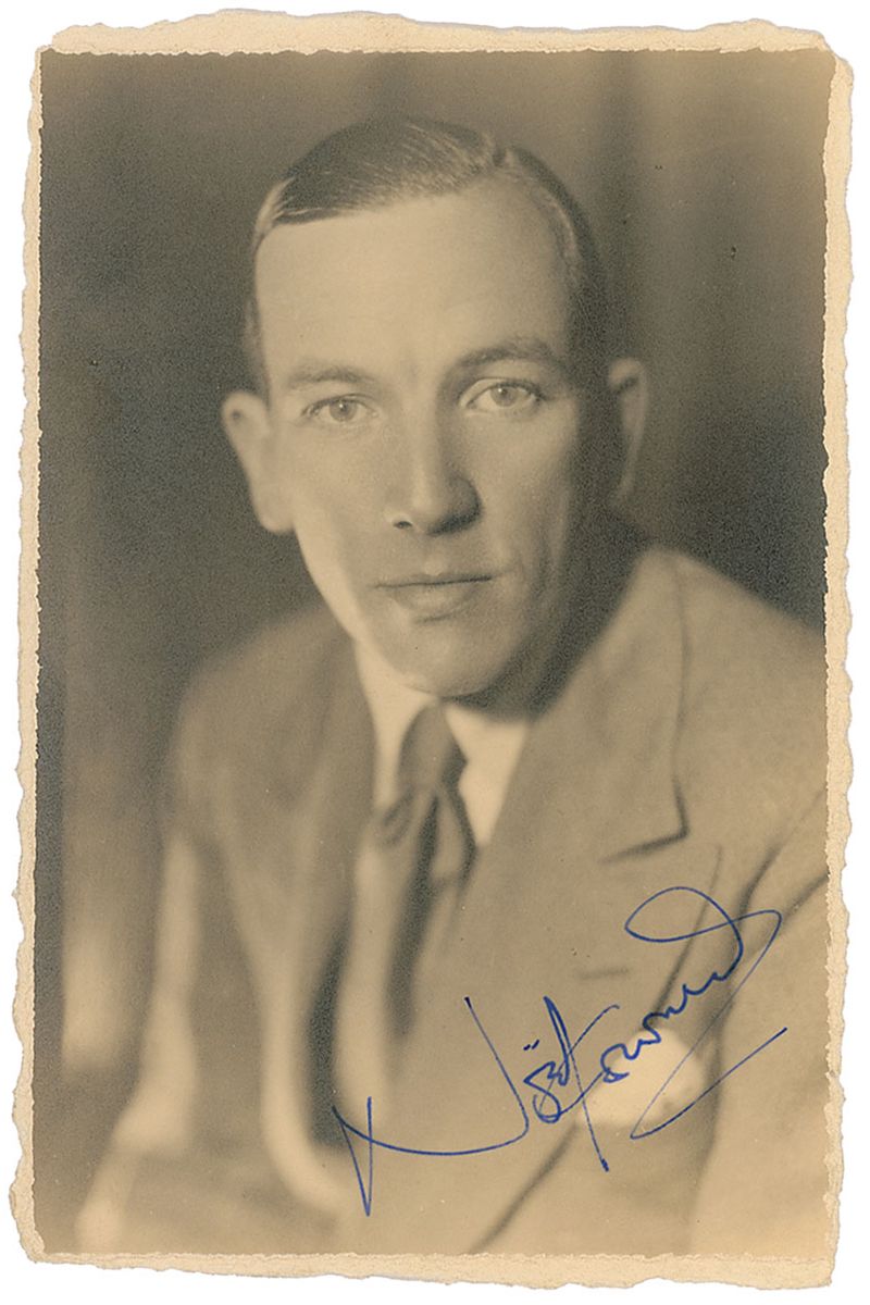 Noel Coward: Choice vintage matte-finish 3.5 x 5.5 bust portrait of Coward in a handsome suit and tie, signed in fountain pen. Bears a collector’s date notation to reverse of February 12, 1931. In fine condition.