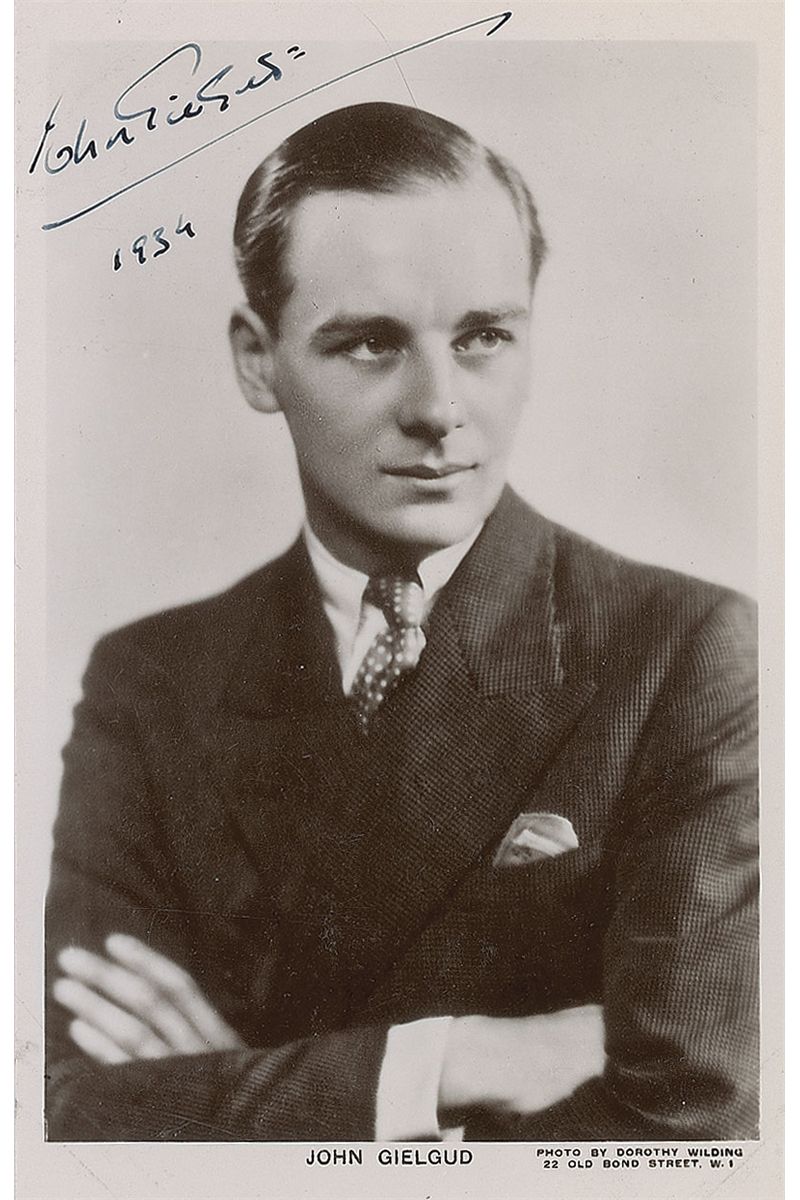 John Gielgud: Semi-glossy 3.5 x 5.5 postcard photo of Gielgud from very early in his career, signed in black ink, “John Gielgud 1934.” In fine condition.