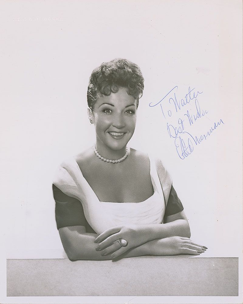 Ethel Merman: Matte-finish 8 x 10 photo by Chris Alexander, signed and inscribed in blue ballpoint, “To Walter, Best wishes, Ethel Merman.” In fine condition, with a couple creases to bottom edge and a photographer’s stamp to top.