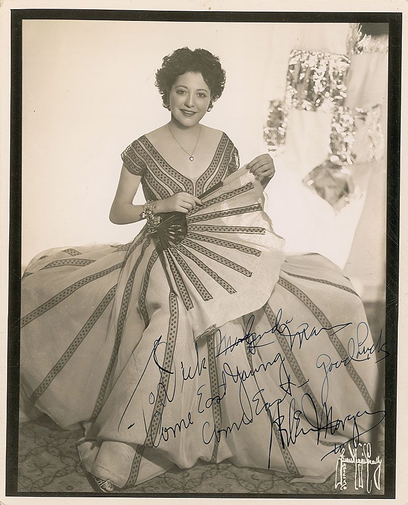 Helen Morgan: Vintage glossy 8 x 10 double-weight photo of Morgan in a flowing gown holding a matching fan, signed and inscribed in fountain pen, “To Dick Mongende—Come East young man, Come East—Good luck, Helen Morgan.” A tack hole to top edge and scattered creases, heavier to right side, otherwise fine condition.