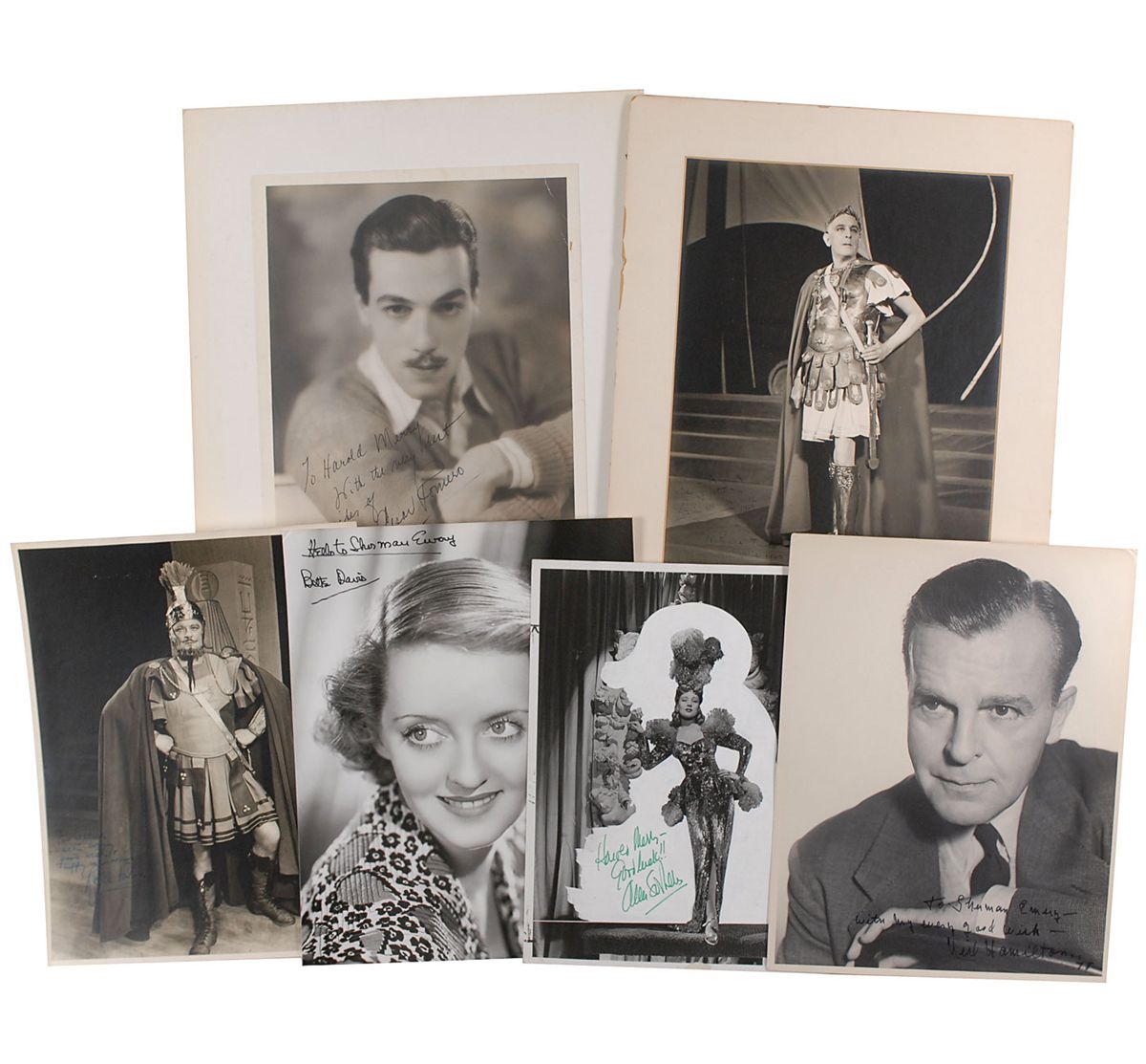 Desirable collection of six photos of various sizes, each signed by a notable actor or actress, including: Cedric Hardwicke, Cesar Romero, Neil Hamilton, Ann Sothern, Bette Davis, and Ralph Forbes. In overall very good to fine condition. Individual descriptions are as follows: