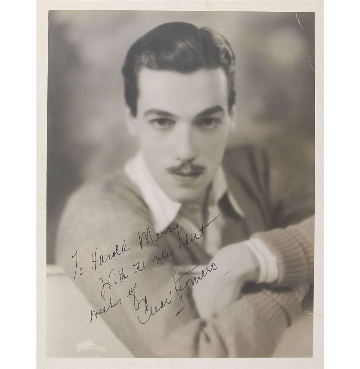 Cesar Romero: Dashing vintage matte-finish 10.25 x 13.25 photo of a very young Romero looking into the camera, signed and inscribed in fountain pen, “To Harold Merry, With the very best wishes of Cesar Romero.” Photo is mounted to an overall size of 14.5 x 19. Some scattered light creases working in from the edges, not affecting the signature or overall appearance, otherwise fine condition.