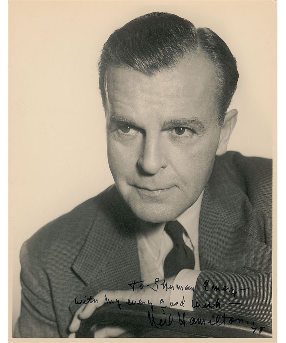 Neil Hamilton: Vintage matte-finish 11 x 14 photo, signed and inscribed later in black felt tip, “To Sherman Emery—with my every good wish—Neil Hamilton ’78.” In fine condition, with some minor corner tip dings.