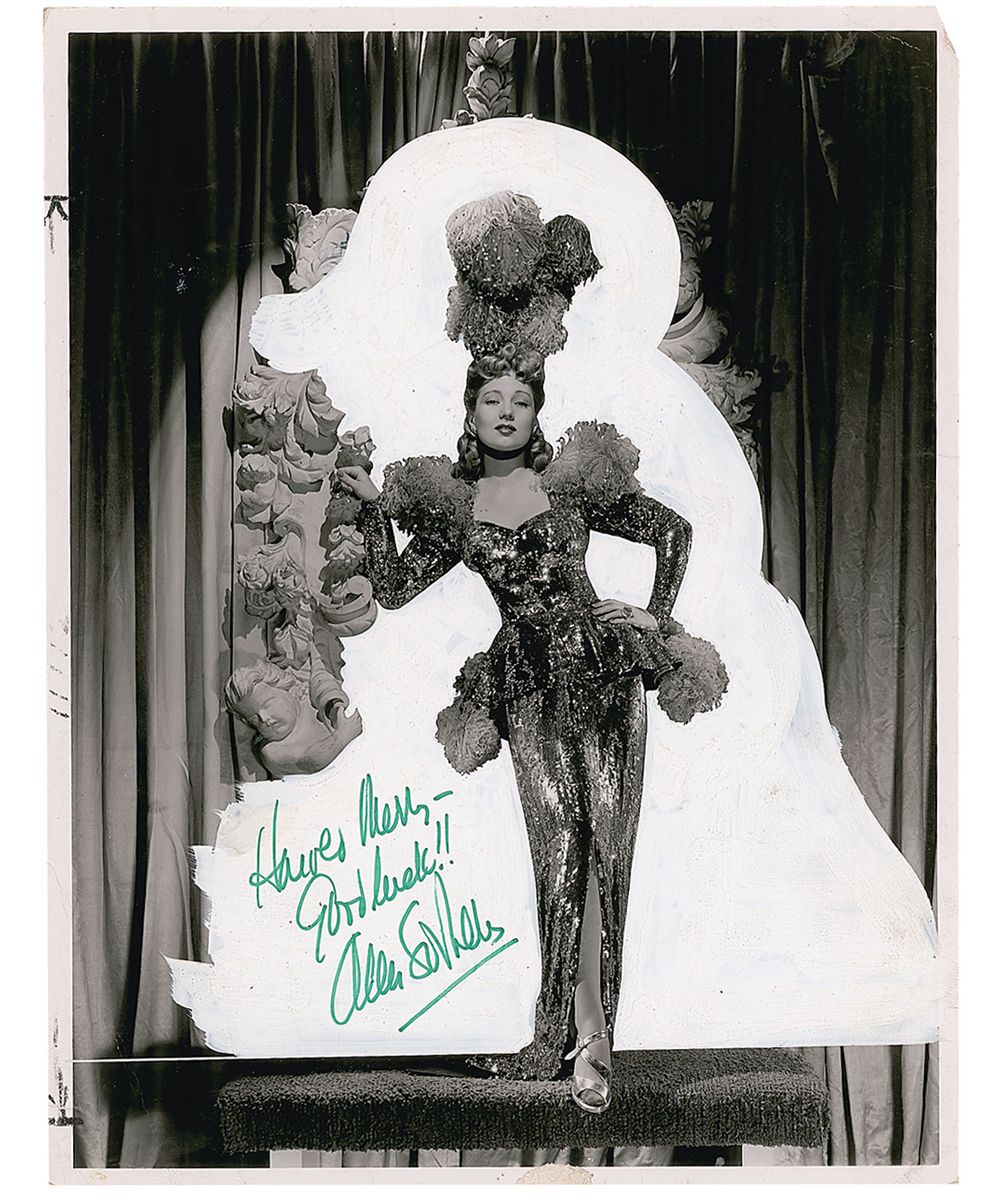 Ann Sothern: Vintage pearl-finish 10 x 13 double weight full-length MGM publicity photo of Sothern in an elaborate dress for Maisie Gets Her Man, signed and inscribed later in green felt tip, “Harold Merry—Good luck!! Ann Sothern.” In very good condition, with a few crop marks to borders, heavy touch-up behind image for printing purposes, missing corner tip, and production notations to reverse.