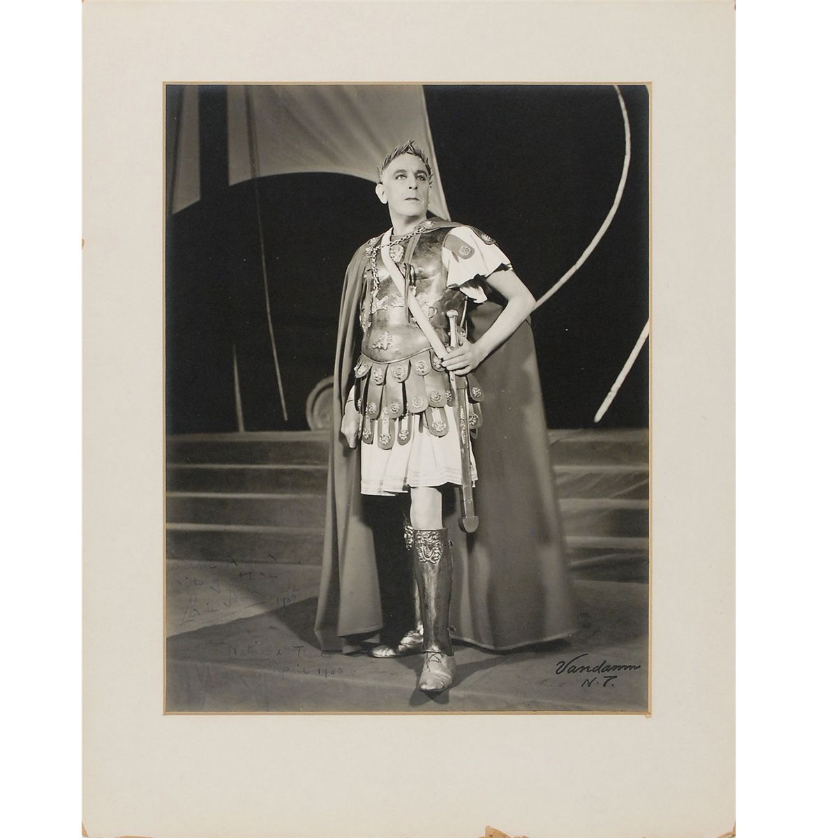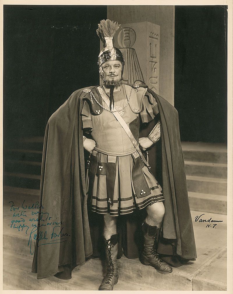 Cedric Hardwicke: Vintage matte-finish 10 x 13 full-length portrait of Hardwicke as Julius Caesar, signed and inscribed in fountain pen, “To Walter Alfred, with gratitude, Cedric Hardwicke, 1950, National Theatre, April 1950.” Matted to an overall size of 11 x 14. Signature and inscription quite light but legible and some edge chipping to mat, otherwise fine condition. In April 1950, Hardwicke was starring in George Bernard Shaw’s play Caesar and Cleopatra.