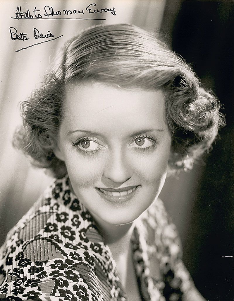 Bette Davis: Satin-finish 11 x 14 head-and-shoulders photo of the lovely actress, signed and inscribed in black felt tip, “Hello to Sherman Emery, Bette Davis.” In fine condition.