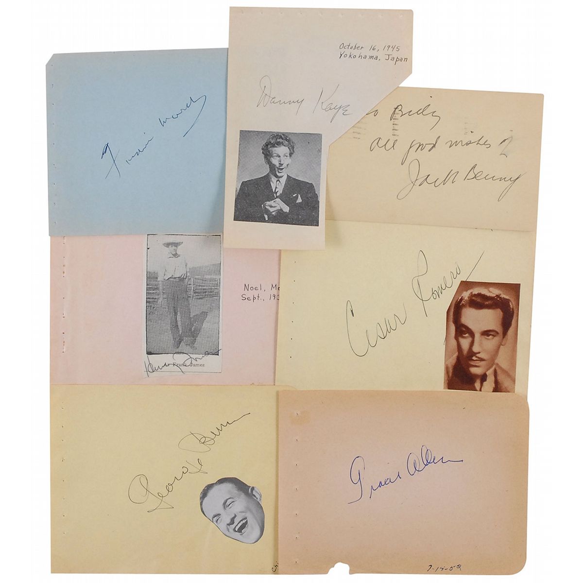Collection of 77 vintage fountain pen and pencil signatures on individual album pages, cards, and slips, some with small photos attached. Signers include: Fredric March, Henry Fonda, George Burns, Gracie Allen, Mae West, Paul Lukas, Ralph Bellamy, Robert Montgomery, Raymond Massey, Cesar Romero, Ray Milland, Danny Kaye, Arleen Whelan, George Raft, Jack Benny (ins), Elizabeth Bergner, George Jessel, Mickey Rooney, Michael O’Shea, John Bricker, Helmut Dantine, John Hall, Frances Langford, Patsy Kelly, Dinah Shore, Clare Booth Luce, Tom Neal, Chester Bowles, Katharine Cornell, Ethel Merman, Martha Scott, Beatrice Kay, Lou Holtz, Duncan Hines, Dusolinna Giannini, Joan Davis, Chili Williams, Maurice Evans, Gertrude Lawrence (ins), Bob Crosby, Francis Lederer (2), Lyle Talbot, Wynne Gibson, John Hubbard, Warren Hull, Philip Reid, Evelyn Brent, Leon Errol, Madeline Carroll, Edgar Bergen, Frachot Tone, Louise Campbell, Margo, Frank Fay, Connee Boswell, Madge Evans, Dorothy Lee, Judith Anderson, Warren William, Hugh Herbert, Harry Richman, Lya Lys, Vera Zorina, Joe Penner, Binnie Barnes, Nancy Kelly, Janice Rule, and Douglass Montgomery. In fine condition.