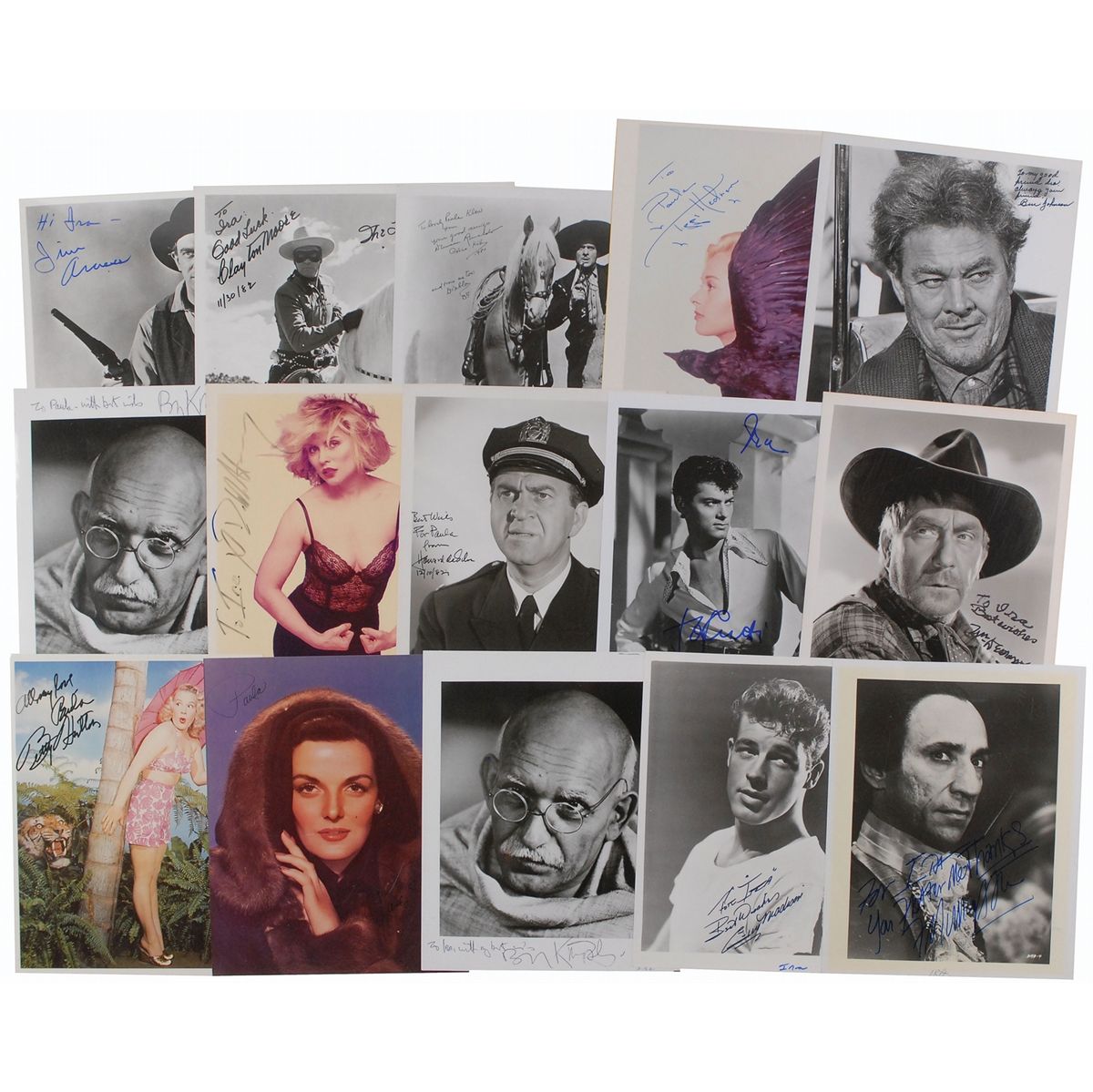Collection of 15 glossy 8 x 10 photos of various actors and actresses, each signed by the person pictured, many inscribed to Paula or Ira Klaw, including: F. Murray Abraham, James Arness, Tony Curtis, Howard Da Silva, William Demarest, Debbie Harry, Tippi Hedren, Betty Hutton, Ben Johnson, Ben Kingsley (2), Guy Madison, Clayton Moore, Duncan Renaldo, and Jane Russell. In overall fine condition. Originate from the collection of the legendary Movie Star News, run by the Klaw family.
