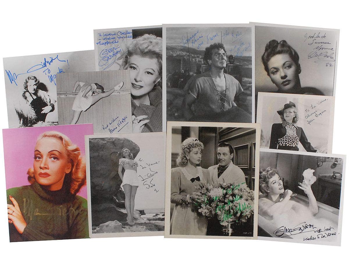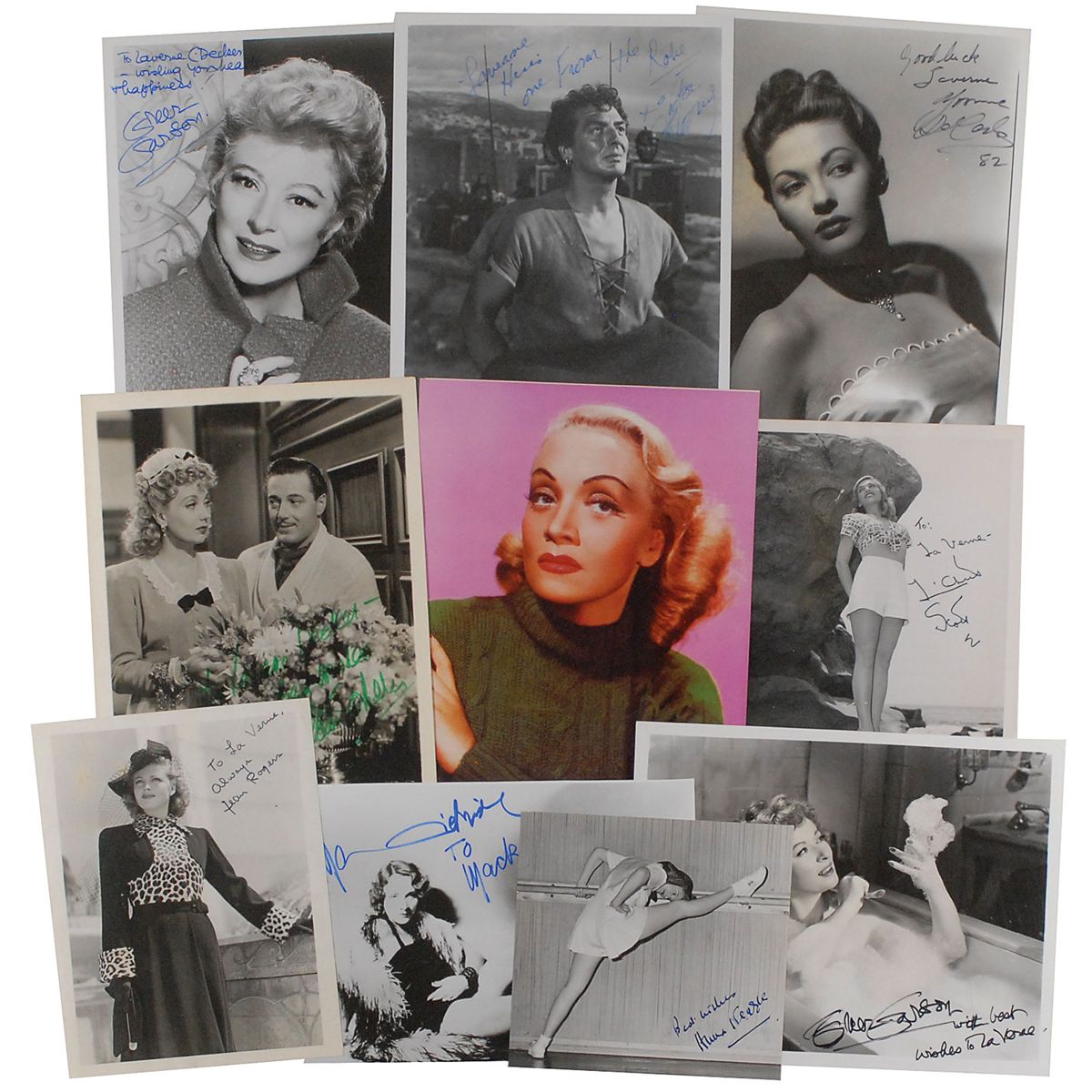 Collection of ten signed photos, ranging in size from 8 x 10 to 6.5 x 6, each signed by the actor or actress pictured: Greer Garson (2), Jean Rogers, Marlene Dietrich (2), Anna Neagle, Lizabeth Scott, Ann Sothern, Victor Mature, and Yvonne DeCarlo. All but the Neagle, Mature, and one Dietrich are also inscribed. Various light scattered creases and discoloration to images, otherwise fine condition.