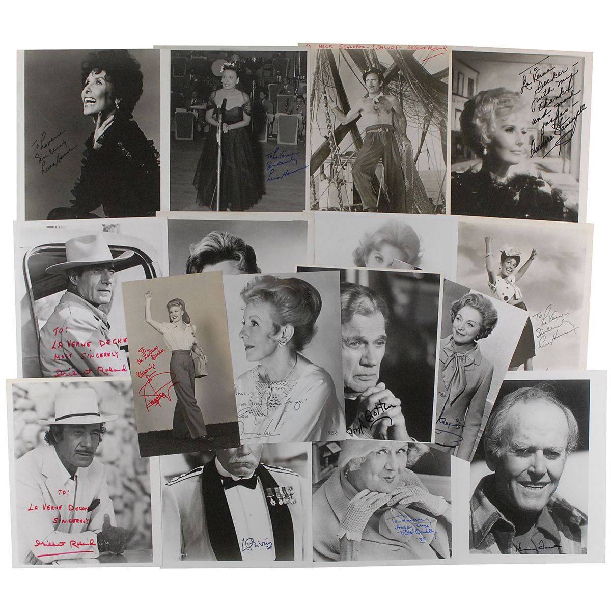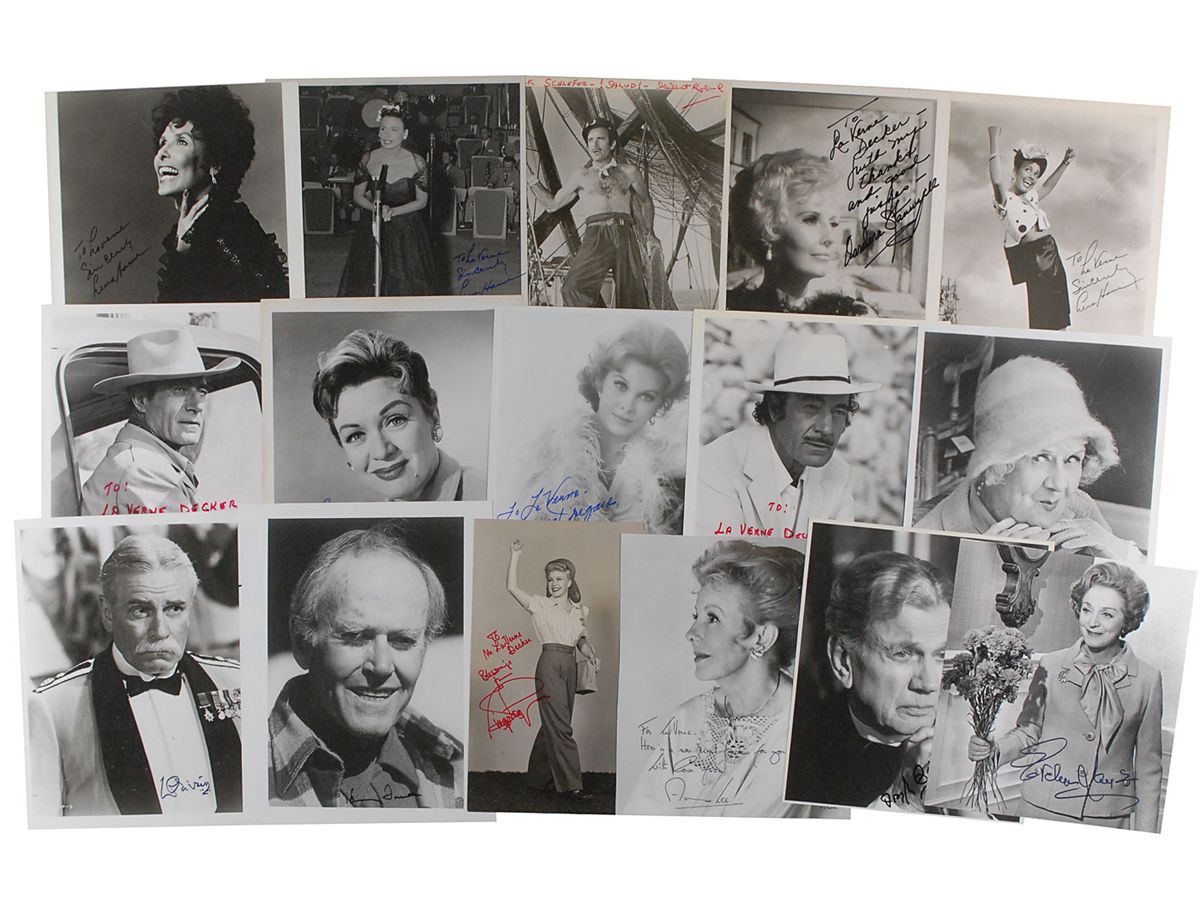 Collection of 16 signed photos, ranging in size from 8 x 10 to 5.25 x 9, each signed by the actor or actress pictured: Barbara Stanwyck, Rhonda Fleming, Henry Fonda, Lena Horne (3), Gilbert Roland (3), Ginger Rogers, Joseph Cotton, Laurence Olivier, Eve Arden, Ruth Donnelly, Anna Lee, and Evelyn Laye. All but the Fonda, Cotton, Olivier, and Laye are also inscribed. In overall fine condition, with trimmed edges to a couple photos.